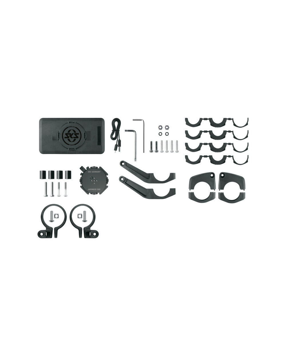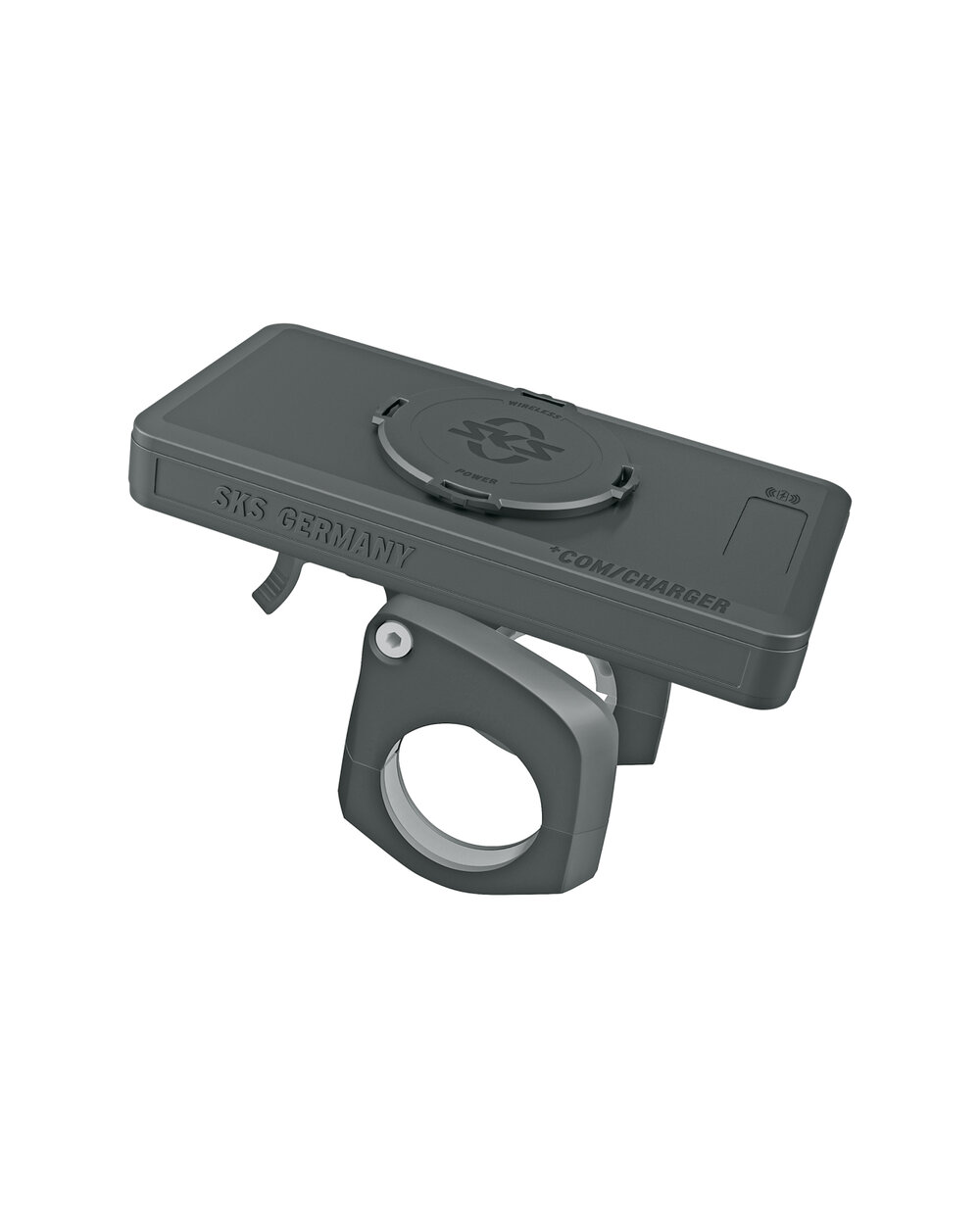 The COMPIT+ system consists of a smartphone holder and a power bank. Any mobile device equipped with a wireless charging function can be connected to the COM/CHARGER holder and charged on the go. With a single turn, the smartphone can be fixed horizontally or vertically thanks to the wide bayonet holder. The mobile phone holder can be easily mounted on a variety of handlebars. Recharge in a moment The complete set with attached spacers offers, in addition to the clamping arms, the possibility of attaching the mobile phone holder to the electric bicycle with a central display, so that the smartphone and the on-board computer form a closed unit on the handlebars. Comes with a 10,000 mAh power bank. Note: COMPIT smartphone cover/case is required! Only compatible with Bosch Nyon up to 2020. Diameter: 22.2 - 25.4 - 31.8 - 35 mm - Fast charging function - Includes 10,000 mAh power bank - Inductive charging function - Horizontal and vertical mounting - Adjustable angle - Suitable for all bikes - With a spacer for different mounting options