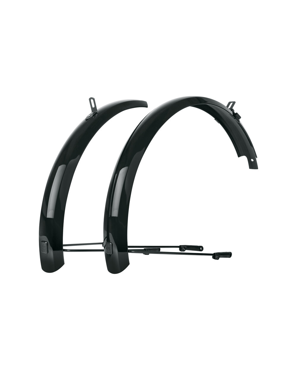 SKS Bluemels Basic is a set of fenders made of robust sandwich construction. The shiny design can impress, it reliably protects against dirt and splashing water. Thanks to the flexible sandwich construction, in which ultra-fine aluminum strips are embedded in a plastic coating, the fenders are extremely robust, rigid and resistant to corrosion. They serve as excellent protection thanks to their mounting close to the casing. Whether on dirt roads or forest roads, BLUEMELS Basic mudguards offer excellent all-round protection. The ESC safety system disconnects the struts in the event of branches caught between the spokes of the wheel, so that the wheel cannot get stuck.Includes a set of struts, a solid stainless steel bridge and mounting material.• Sandwich design made of aluminum / plastic