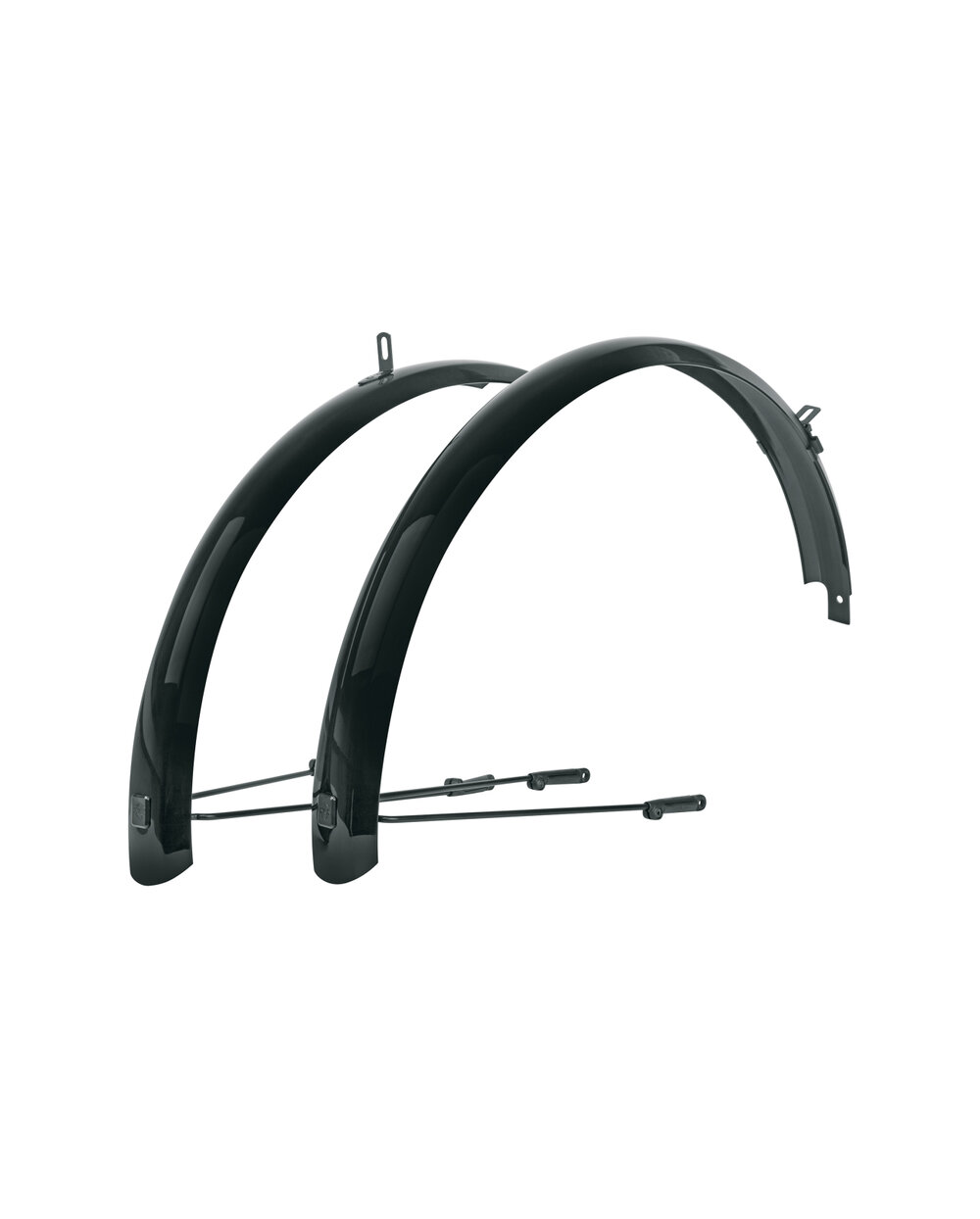 SKS Bluemels Basic is a set of fenders made of robust sandwich construction. Their shiny design can impress, reliably protects against dirt and splashing water. Thanks to the flexible sandwich construction, in which ultra-fine aluminum strips are embedded in a plastic coating, the fenders are extremely robust, rigid and resistant to corrosion. They serve as excellent protection thanks to their mounting close to the casing. Whether on dirt roads or forest roads, BLUEMELS Basic mudguards offer excellent all-round protection. The ESC safety system disconnects the struts if branches are caught between the spokes of the wheel so that the wheel cannot get stuck.Includes a set of struts, a solid stainless steel bridge and mounting material.• Sandwich design made of aluminum/plastic