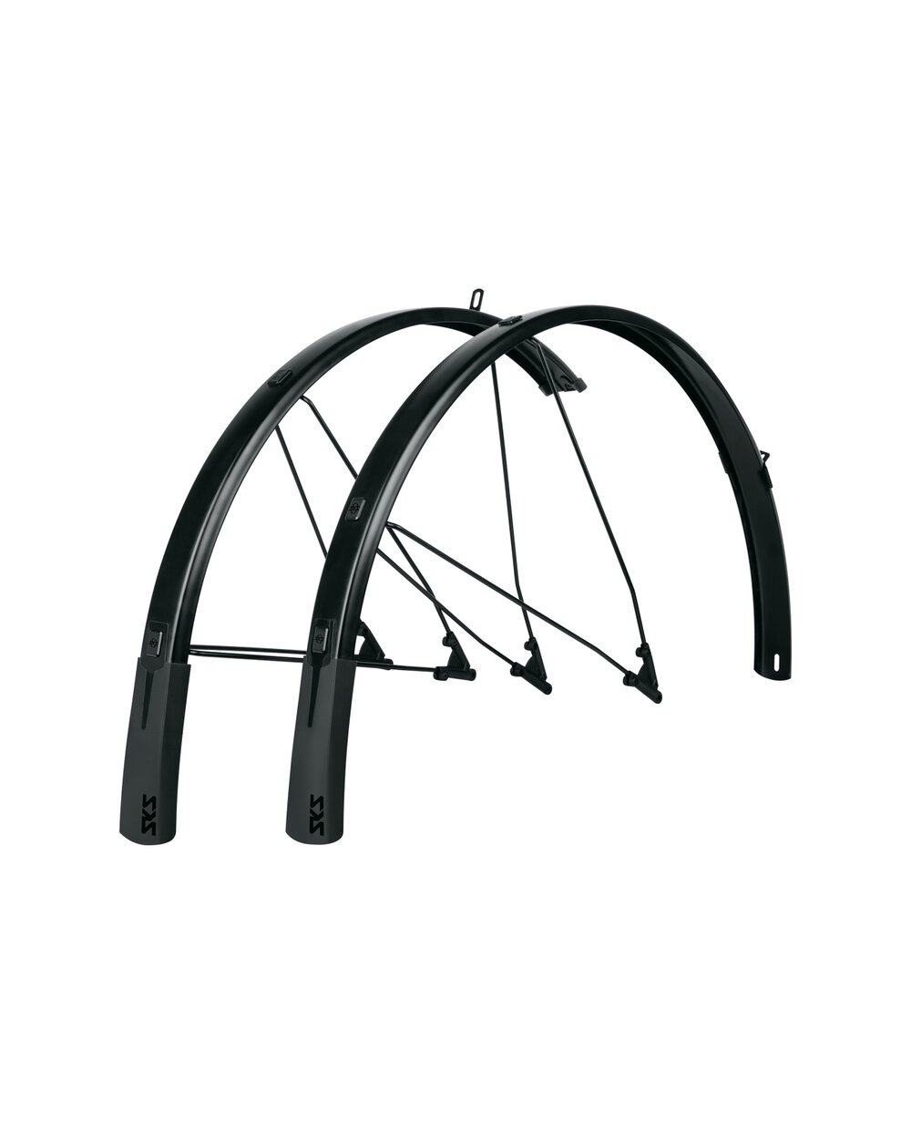 SKS Bluemels Style is a set of fenders with a flexible spoiler that offers excellent all-round splash protection. Thanks to the flexible sandwich construction, in which ultra-fine aluminum strips are embedded in a plastic coating, the fender is extremely robust, rigid and resistant to corrosion. The model has a new V-adapter with an ESC safety system that disconnects the double U-struts if branches get caught between the tips. This should prevent the wheel from getting stuck. With a matte black finish and black fasteners, the mudguards have a uniform design and stand out in terms of appearance as well.Including accessories and brackets.• Aluminum/plastic sandwich construction • With flexible spoiler • V-adapter with ESC safety system • Robust double U-struts • Made in Germany color: matte black wheel size: 27.5" - 29" tire width in mm: 30-45mm front fender length: 500mm rear fender length: 800mm