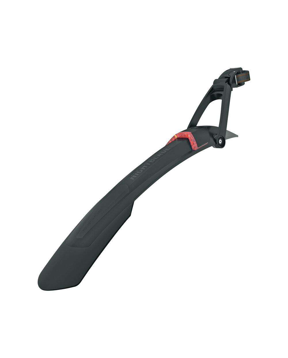 The Nightblade fender is an ideal solution for mountain bikes. It not only provides excellent protection against splashing water, but also increases safety thanks to the integrated rear light with rechargeable battery. The light can be easily removed and charged via USB. Thanks to the simple clamping system, the mudguard is compatible with almost all types of seatposts, while its adjustability with two joints ensures a perfect fit for every bike.• Integrated rear light: Rechargeable via USB, easily removable • Universal mounting: Compatible with most seatposts thanks to simple attachment • Adjustability: Two joints for ideal bike fit • Suitable for: 29" and 27.5+ wheels with a tire width of 52-75 mm (max. width 3.0") • Fender length: 620 mm
