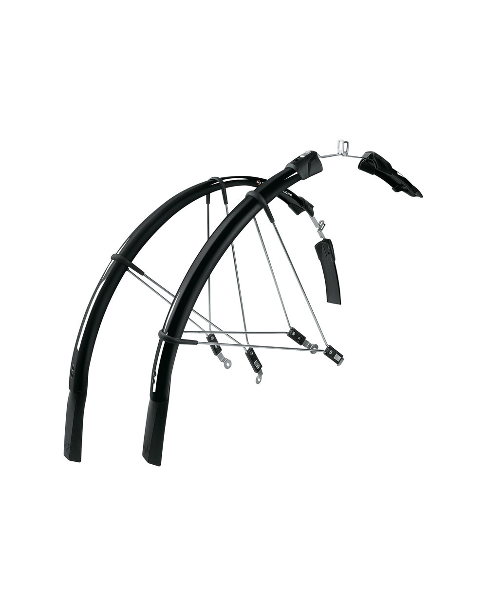 SKS Raceblade Long are extra long mudguards for road bikes, ideal for rainy weather or for winter training. The end of each fender extends below the hub. This length guarantees full coverage, which means that you and the cyclist behind you are protected from splashing water. They can be perfectly adapted to the radius of the wheel by adjusting the length of the holders. Once the metal mounting brackets are attached to the bike, the mudguards can be clipped on or off in seconds, ideal when needed. The brackets are attached to the brake screws and to the quick release. For tire size 700x20-25C Material: plastic Front fender length: 525 + 150 mm Rear fender length: 805 + 150 mm