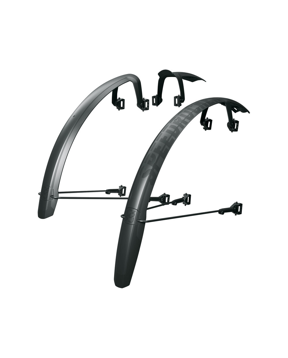 The SKS SPEEDROCKER XL fender set made of impact-resistant, high-strength plastic is now also available for tires up to 52 mm wide. An exceptional feature is the function of a double spoiler on the front fender, which is attached with rubberized Velcro fasteners. The rear fender provides excellent splash protection thanks to the telescopic profile and attaches to the frame with strong rubber straps.Flexible mounting system for any geometryMounting with flexible adapters is designed to fit any frame. The integrated U-struts with the ESC safety system ensure not only a clean appearance, but also the maximum ground clearance between the tire and fender. Even more protection can be achieved with the optional mudguard extension (order no. S11656), which is also compatible with this XL version.Features:• Made of highly resistant, impact-resistant plastic • Double spoiler on the front mudguard • Telescopic rear mudguard extension • For wider gravel tires (up to 52 mm) • Made in Germany • Weight: 454 g • Front fender length: 500 + 210 mm • Rear fender length: 950 mm