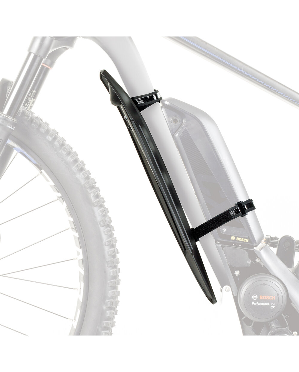 Front mudguard ideal for e-bikes and plus bikes. Mounts to the bottom frame tube, can also be mounted despite the frame battery on e-bikes.