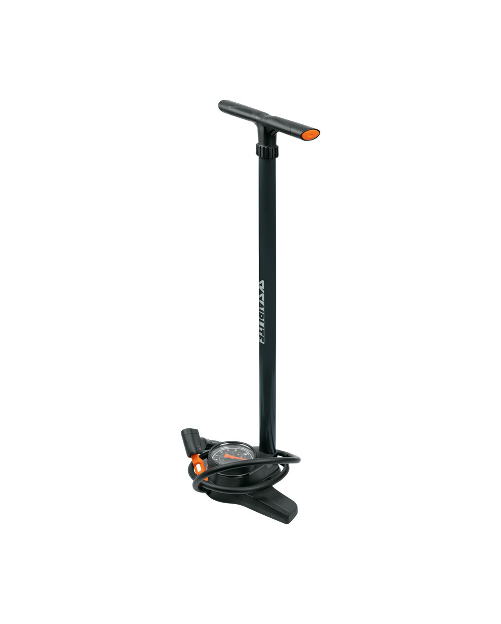 foot pump model for home and workshop use, made of durable plastic. Compared to the previous version, it is 5 cm higher.Multi-Valve-end for all types of valves.