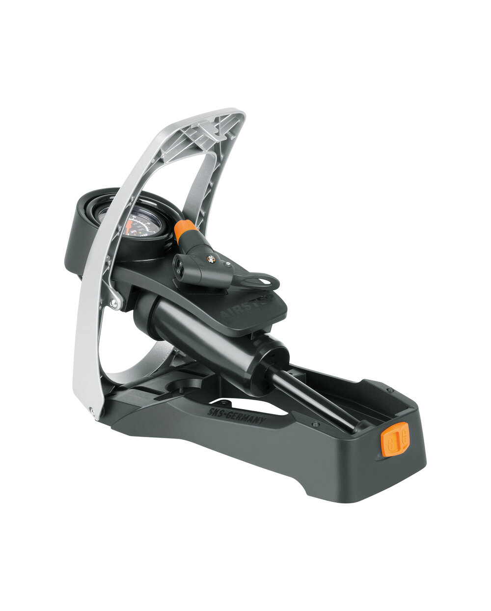 The SKS Germany AirStep foot pump combines the features of a classic pump and the latest technologies Made in Germany. First-class material of the highest quality, construction concept and user-friendly functions (large pressure gauge, integrable spiral hose with valve head for all types of valves) give the pump a completely new and innovative look. The ergonomic robust aluminum foot pedal allows the maximum possible pressurization of 7 bar/102 PSI without difficulty. Inflating has never been so easy and gentle on your back. After inflation, the pedal is pressed and secured with a button to save space. There is also the possibility of hanging thanks to the attached wall bracket.