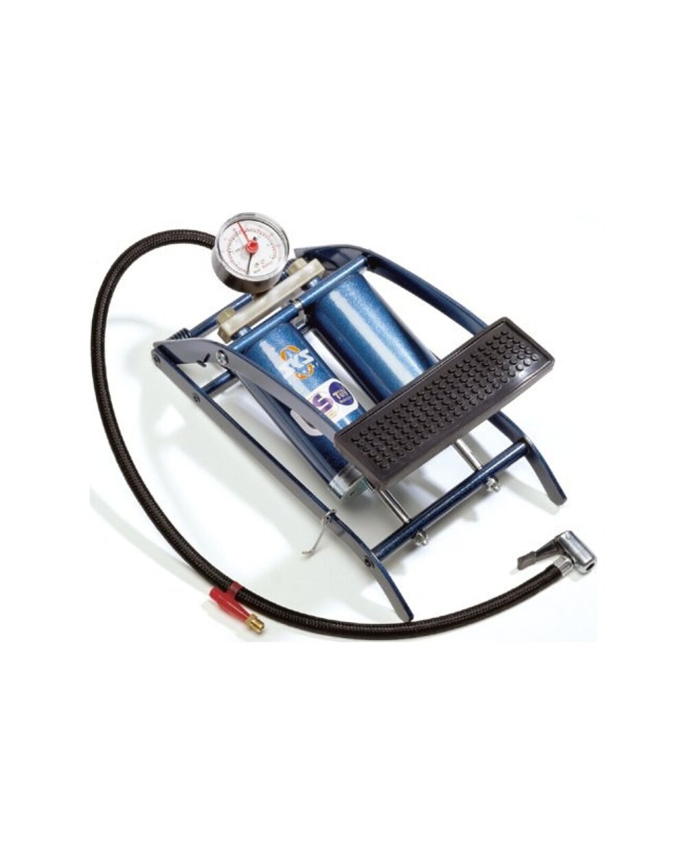 Foot - pedal pump SKS Twin Air for blowing bicycles, boats, inflatable mattresses, deck chairs, etc. Hose for auto valve with reducer. Compared to the Picco foot pump increased performance thanks to two air tanks. Max. 5 BAR / 73 PSI including pressure gauge