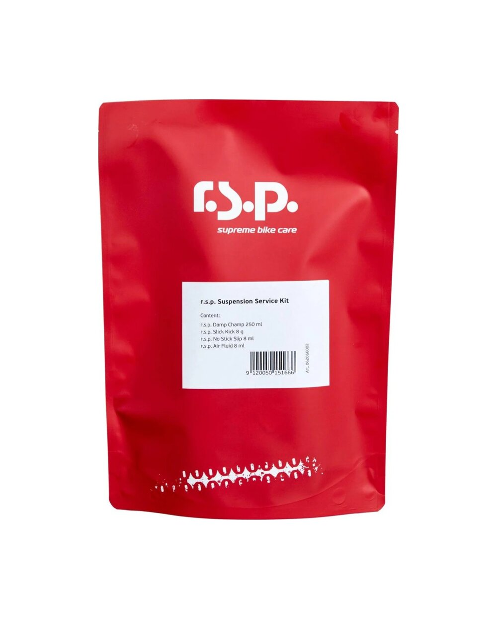 RSP service kit for suspension (forks and shock absorbers), which contains 250 ml of fully synthetic "Damp Champ"oil with a viscosity of 5 wt,"Slick Kick"lubricant (8 g),"No Stick Slip"additive (8 ml) and"Air Fluid" lubricant (8 ml). The kit is designed to reduce friction and foaming processes in the suspension and ensures smooth, reliable suspension operation even under pressure.