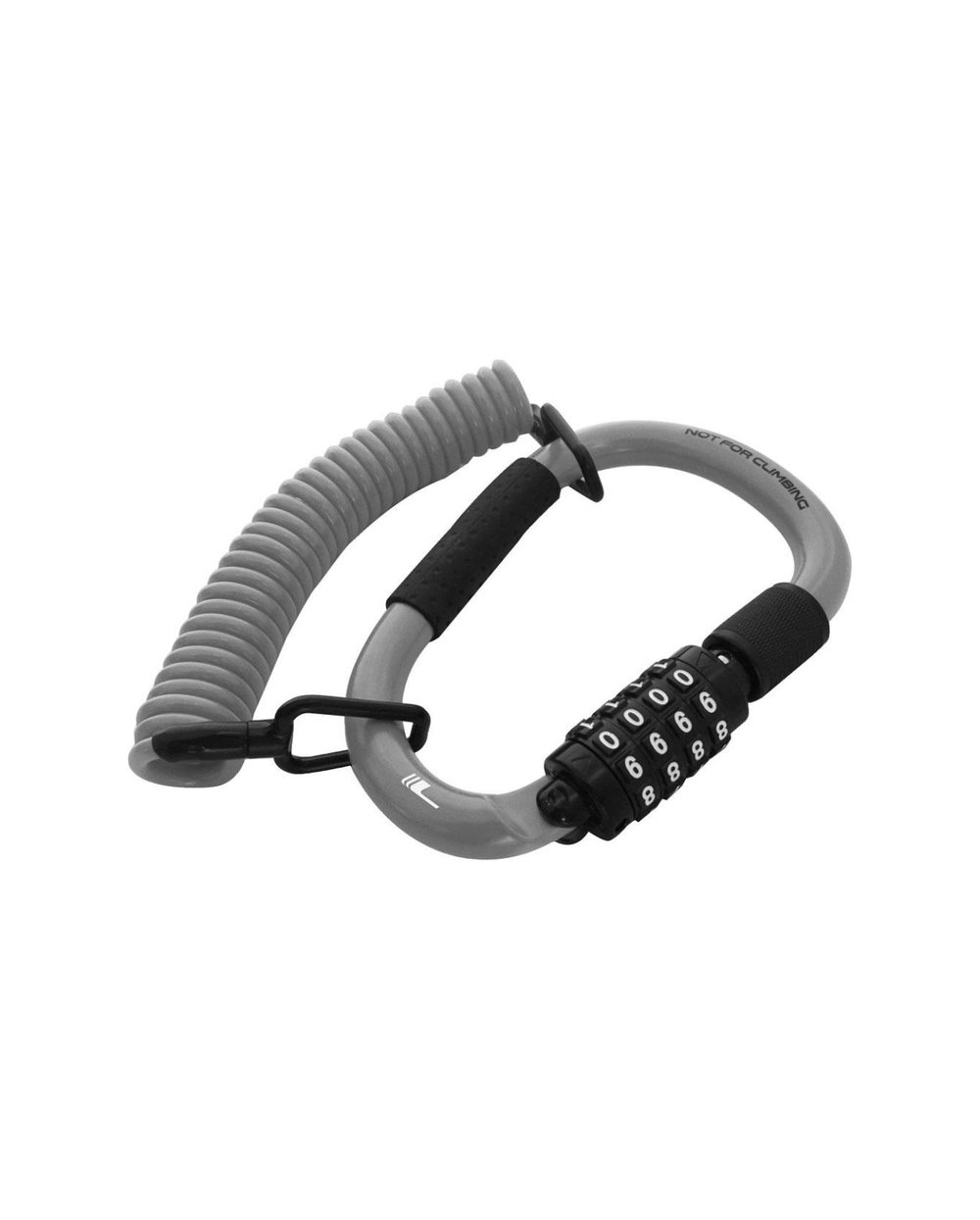 Lightweight GUARD cable spiral lock with carabiner and opening to optional 4 number code. The number code can be changed again at any time. The individual cables are intertwined which significantly increases the level of security. The lock is simply secured with a carabiner against the saddle rails during transport. The carabiner is made of aluminium, which reduces the overall weight of the lock. Due to the flexibility of the lock, it is also possible to lock items with smaller openings, such as a helmet. The lock serves to protect the bike or accessories against occasional theft.