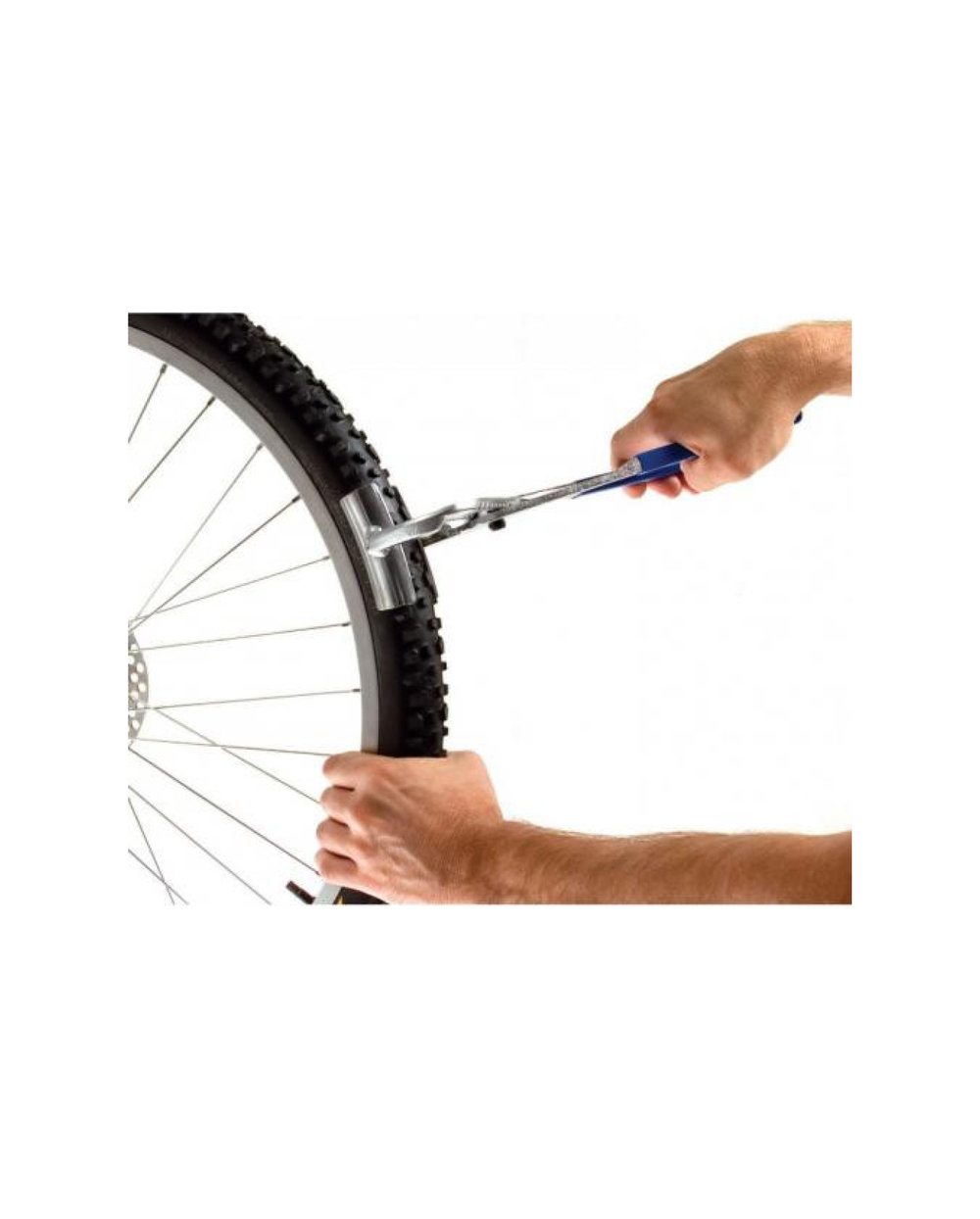 Shaped jaws with rough surface. Adjustable for all bicycle tire sizes.