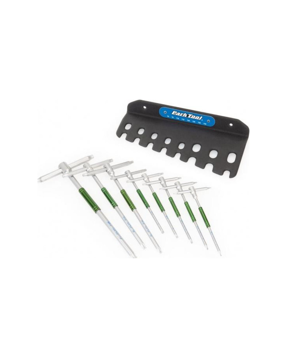 Professional set of 8 TORX wrenches (T6, T8, T10, T15, T20, T25, T30 and T40). Material - heat-treated Cr-Mo steel. Sliding spindle finished with TORX profile at both ends. Green duralumin swivel guide sleeve on wrench body. Depending on size, wrench lengths range from 125 to 305 mm. The set includes a practical 22 cm long tray for quick and easy key storage and removal. Made in the USA.