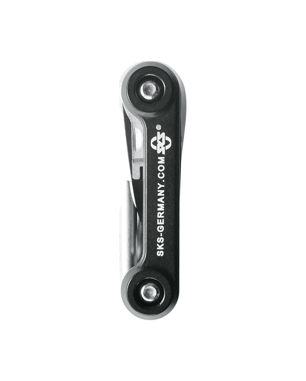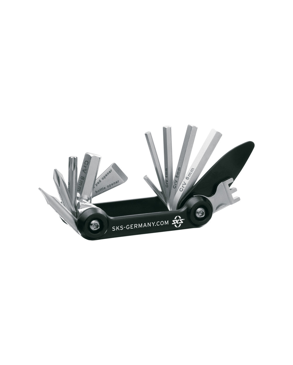 SKS TOM 14 is a lightweight and compact 14-function tool. Imbits: 2.5 / 3 / 4 / 5 / 6 / 8 mm Cross and flathead screwdriver TORX T25 1 mounting lever G14/G15 spanner Bottle opener