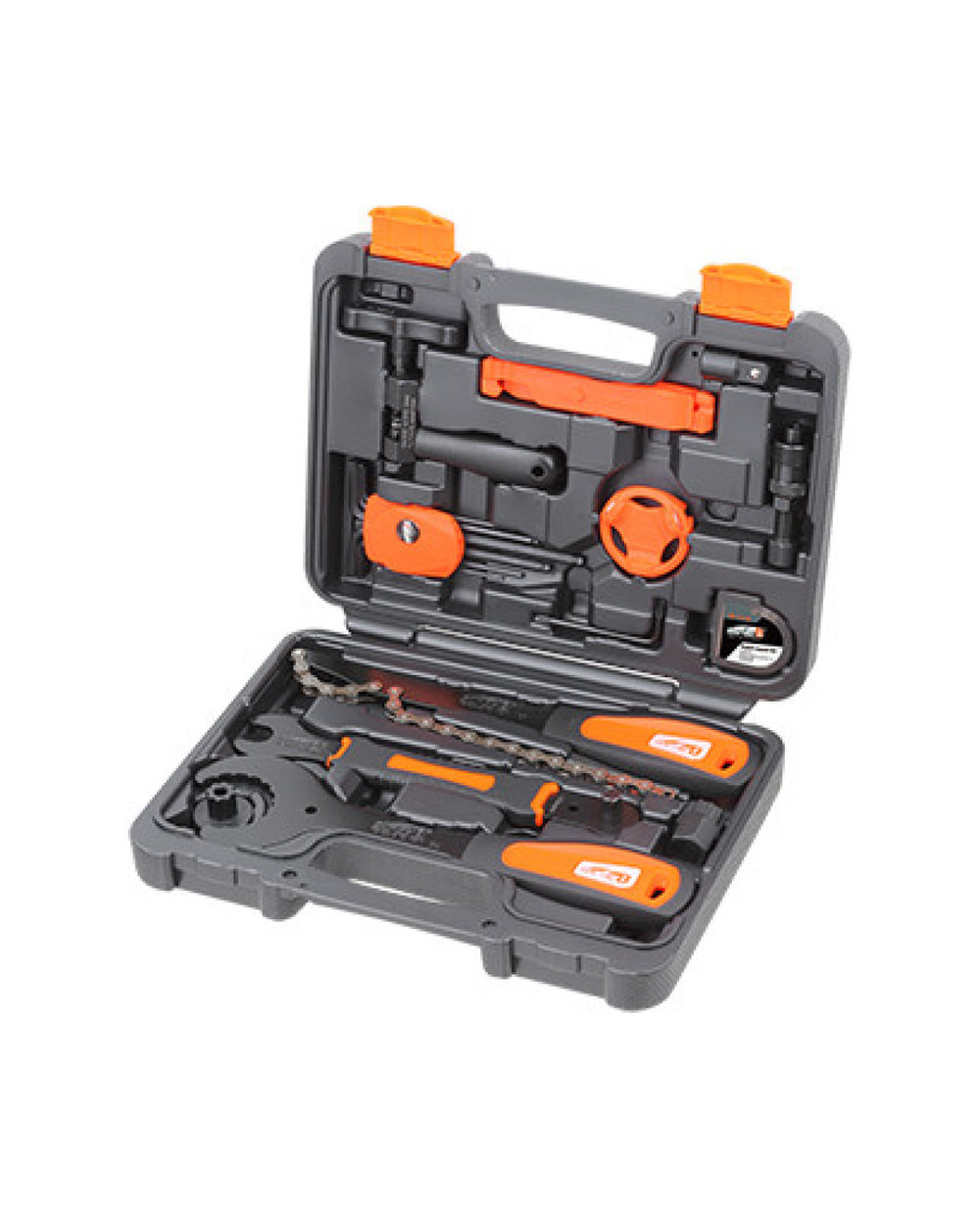 Recreational bike maintenance and repair tool kit containing 21 types of quality tools. The set includes: