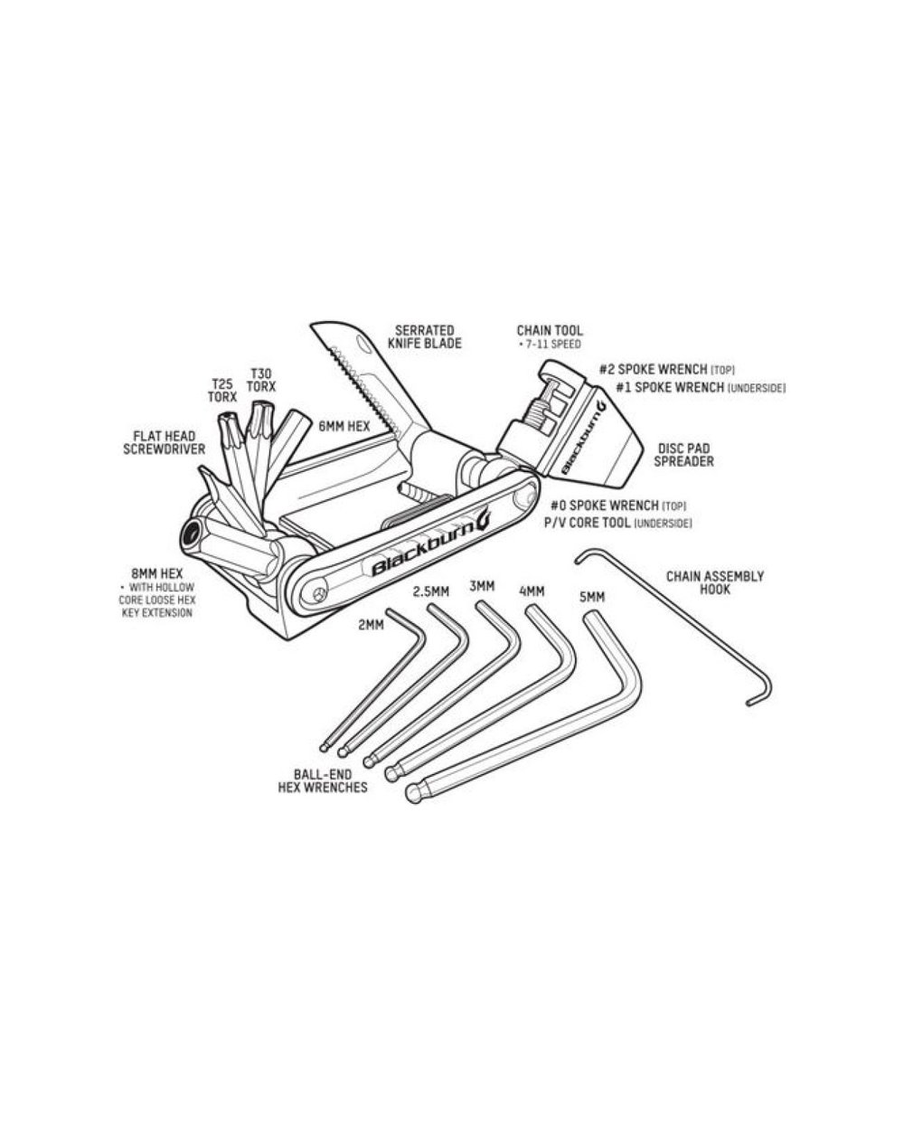 INCLUDES 2; 2,5; 3; 4; 5; 6; 8 mm inbus - screwdriver - torx 25 and 30 - saw - riveter - centering keys 0, 1 and 2 - chain holder - brake pad separator