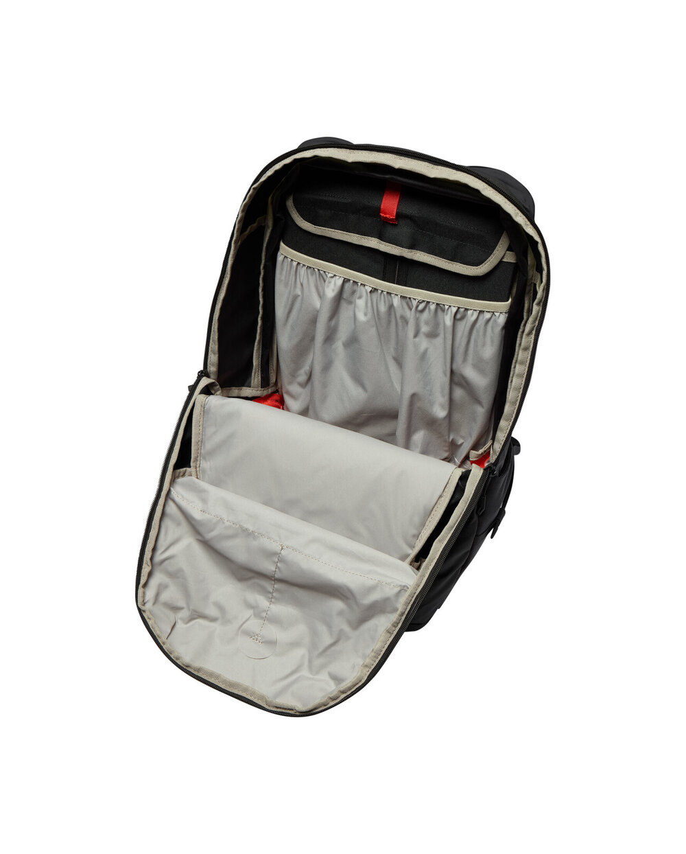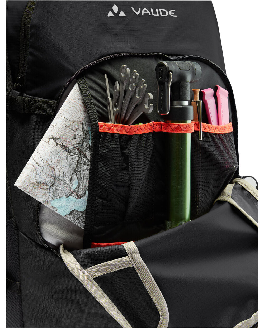 - front chamber, top pocket with mesh organizer, large front compartment separated from smaller exterior side pockets, helmet and lamp holder, includes raincoat Materials used