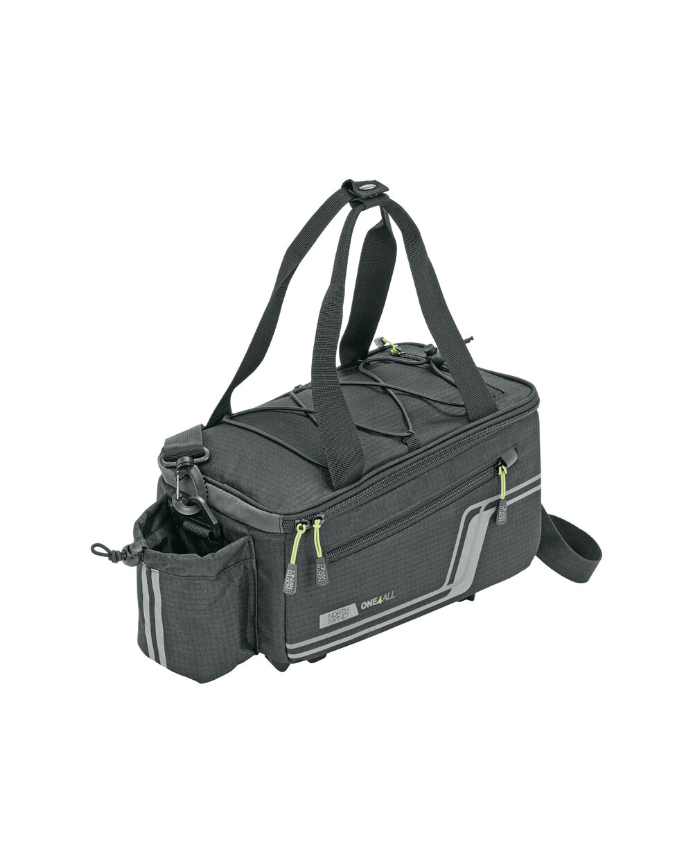 Multifunctional bag with drink holder and practical compartments. These are placed on the sides and in the upper part, so that there is quick access to the mobile phone, keys or wallet. A storage pocket made of elastic mesh allows the transport of additional luggage. The raincoat keeps the bag and its contents dry, while the reflective elements on the water-repellent nylon fabric ensure visibility even in the dark.Secure attachment with the MonkeyLoad adapter plate