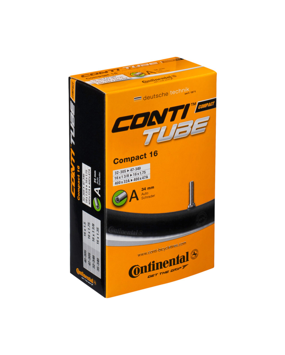 Continental bicycle inner tube with automotive valve, for strollers and children's bikes in 14-inch sizes. Dimension: 18x1 1/4> ; 18x1,9 / 32-355 - 47-400