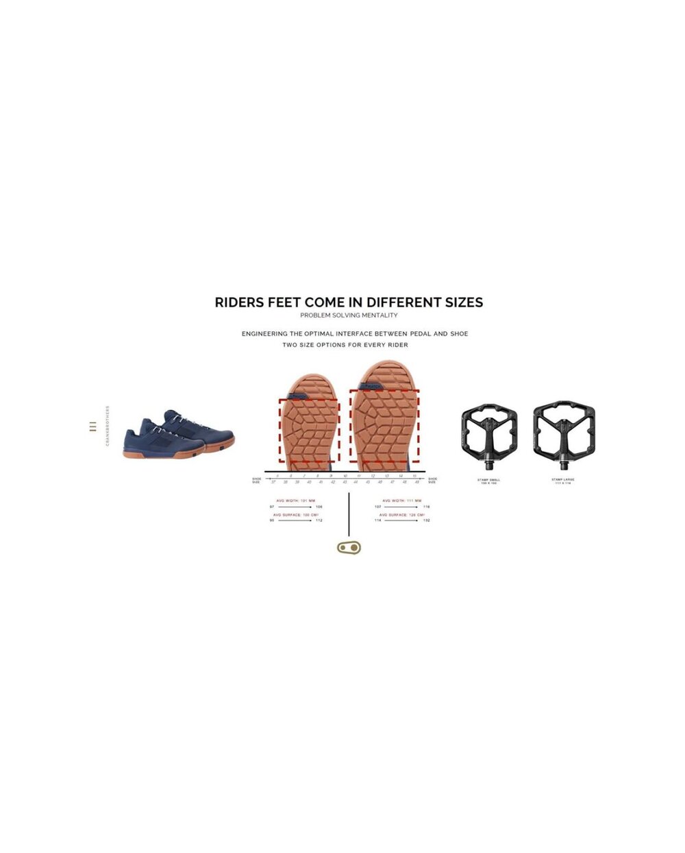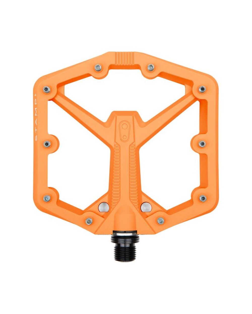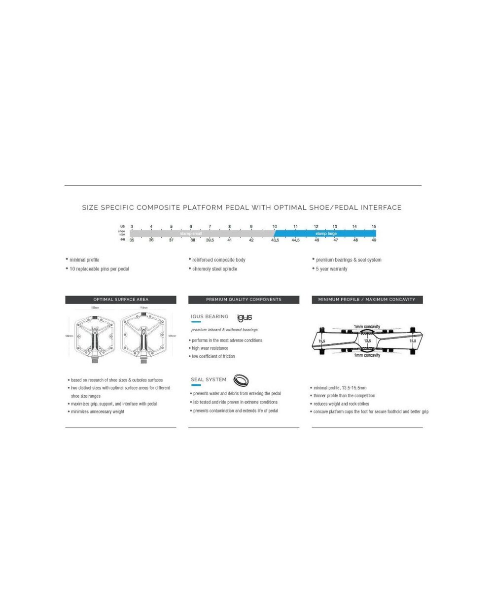The next generation of California's most popular platform pedal is here! The new Stamp 1 pedals build on the legacy of the entire Stamp family of pedals and feature a concave platform for more confidence on the trail, proven internal components from the Stamp 7 pedal for great durability and longevity, and a new one-piece pin design for maximum grip and easy pin replacement! The new version of the Stamp 1 pedals has been created with an uncompromising commitment to quality and boasts a robust nylon body and proven internals from the award-winning Stamp 7 pedals. Use: trail/enduro/freeride/DH/electric bikes/sport/commuting Slim, concave profile - pedal body height 13.5mm to 15.5mm Weight 348g Platform body: 114 x 111mm (shoes 43.5 to 49), height 13.5-15.5mm Platform: nylon composite Axis: forged Cr-Mo steel Inner bearing: Igus LL sliding sleeve Outer bearing: Igus LL sliding sleeve New one-piece replaceable pins, 10 pieces per pedal (inner pin height 23mm, outer pin height 25mm) Stamp Small recommended for shoe sizes: 3-10 (US M) // 37-43.5 (EU) Stamp Large recommended for shoe sizes: 10-15 (US M) // 43.5-49 (EU)