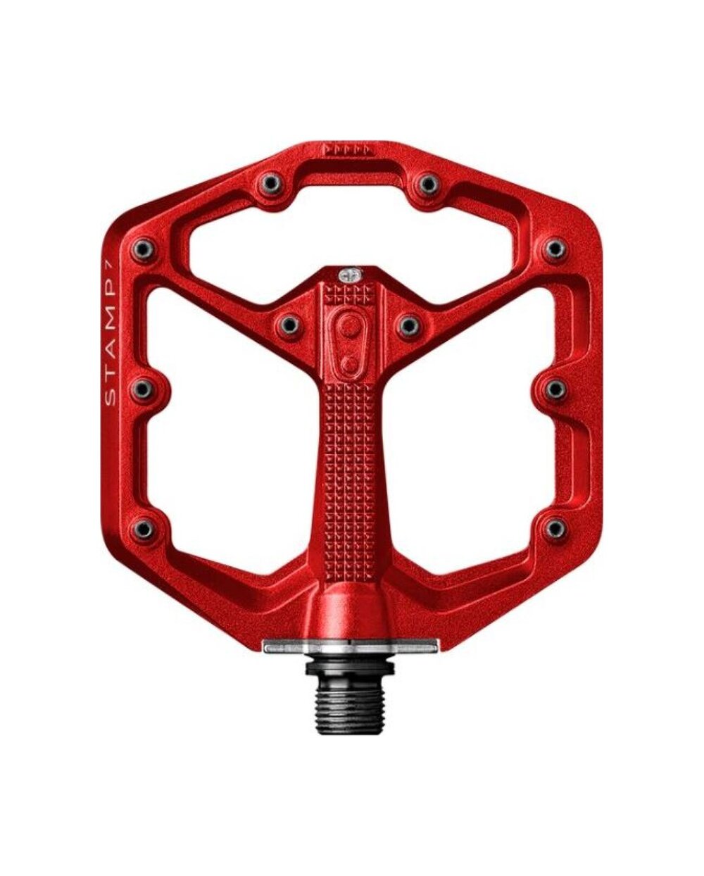 Top platform pedal in two sizes for different shoe sizes. Minimum profile 11-13 mm. WEIGHT 345 g PLATFORM aluminium 6061-T6 (100 x 100 mm, for shoe sizes 37-43) OSA Cr-Mo steel 435 INSIDE LENS Igus LL sliding bushings Outer bearing Igus LL sliding bushings PINS 10 on each side, replaceable TESTS IN MEDIA: http://www.bikeandride.cz/2016/11/pedaly-CrankBrothers-stamp-large-prakticke-predstaveni/