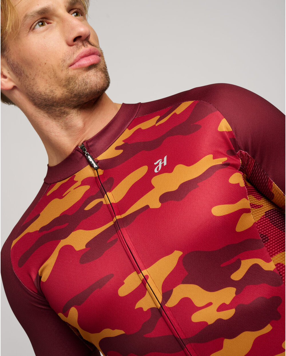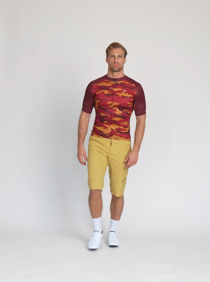 It is made of a more durable stretch material in combination with highly breathable mesh fabric on the sides for sweat wicking. It is equipped with a classic triple pocket and a zipped security pocket. There are anti-slip ends on the lower circumference of the jersey and sleeves. The design of the jersey is complemented by a camouflage pattern that emphasizes its natural character.