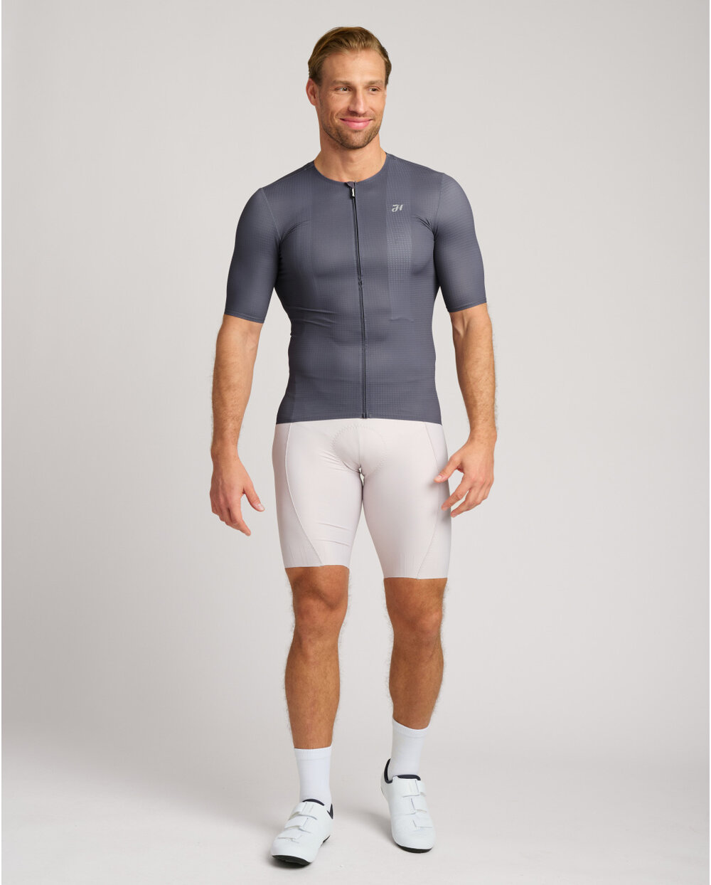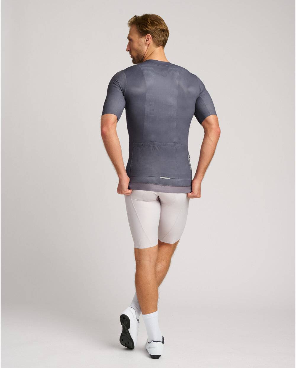 Thanks to our new fabric with a breathable texture, it effectively wicks away moisture even at high performance. It adapts to the figure, firmly maintains the shape and removes flaws. It has an improved collar cut and zip with neck protection, three rear pockets with a hidden zipped pocket and a non-slip finish on the back of the jersey. The minimalist design underlines the timelessness of the jersey.
