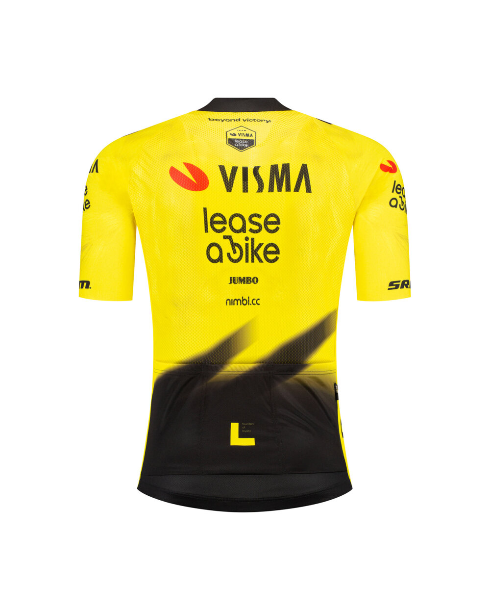 This cycling jersey is a replica of the official aerodynamic clothing worn by Team Visma riders | Rent a bike on site. The aerodynamic sleeves, the breathable and elastic material and the silicone hem guarantee a perfect fit of the jersey. In addition, it has three pockets on the back, including an additional zipped pocket for keys. Find out what it means to ride in the same jersey as Jonas Vingegaard, Wout van Aert, Matteo Jorgenson and other Team Visma riders | Rental and bike.