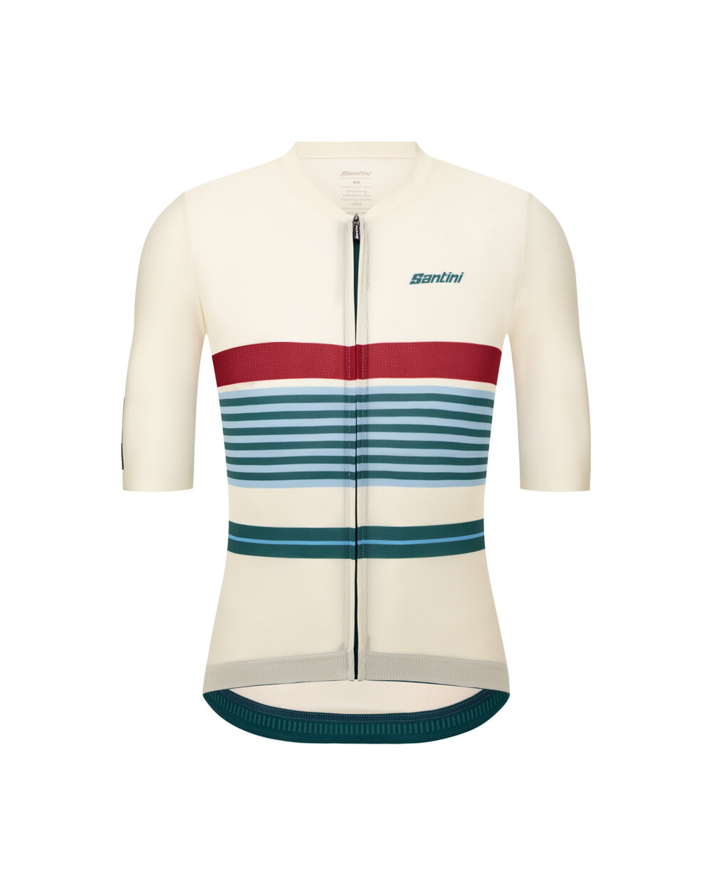 Santini Bengal Evo is a modern evolution of the iconic striped jersey - lightweight, aerodynamic and maximally functional. Light technical material with a close-fitting slim fit and unisex construction perfectly follows the body without restricting movement.Sleeves and collar are seamless (raw-cut) for absolute comfort, while the new inner silicone grip is flexible, antibacterial and hypoallergenic - keeps the jersey in place without pressure or irritation. Elastic waistband with silicone ensures stability even during intensive driving. Thanks to the hidden zip along the entire length, you can easily regulate the ventilation, and the rear three pockets allow you to have everything you need at hand.The jersey combines the aesthetics of the professional peloton with functionality for everyday training – the same style, the same spirit, only in a more civil package.Main advantages:
