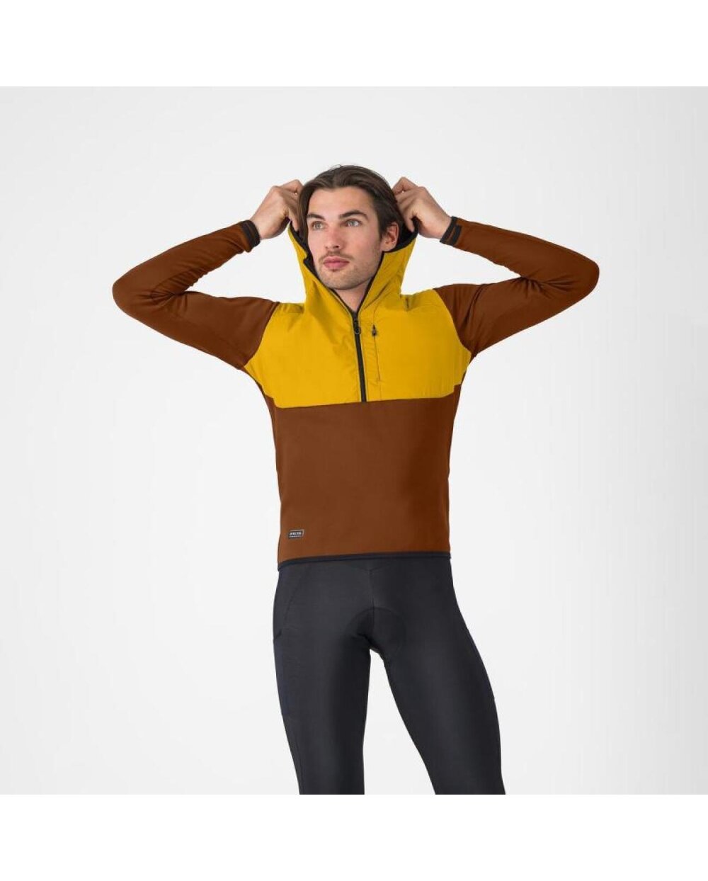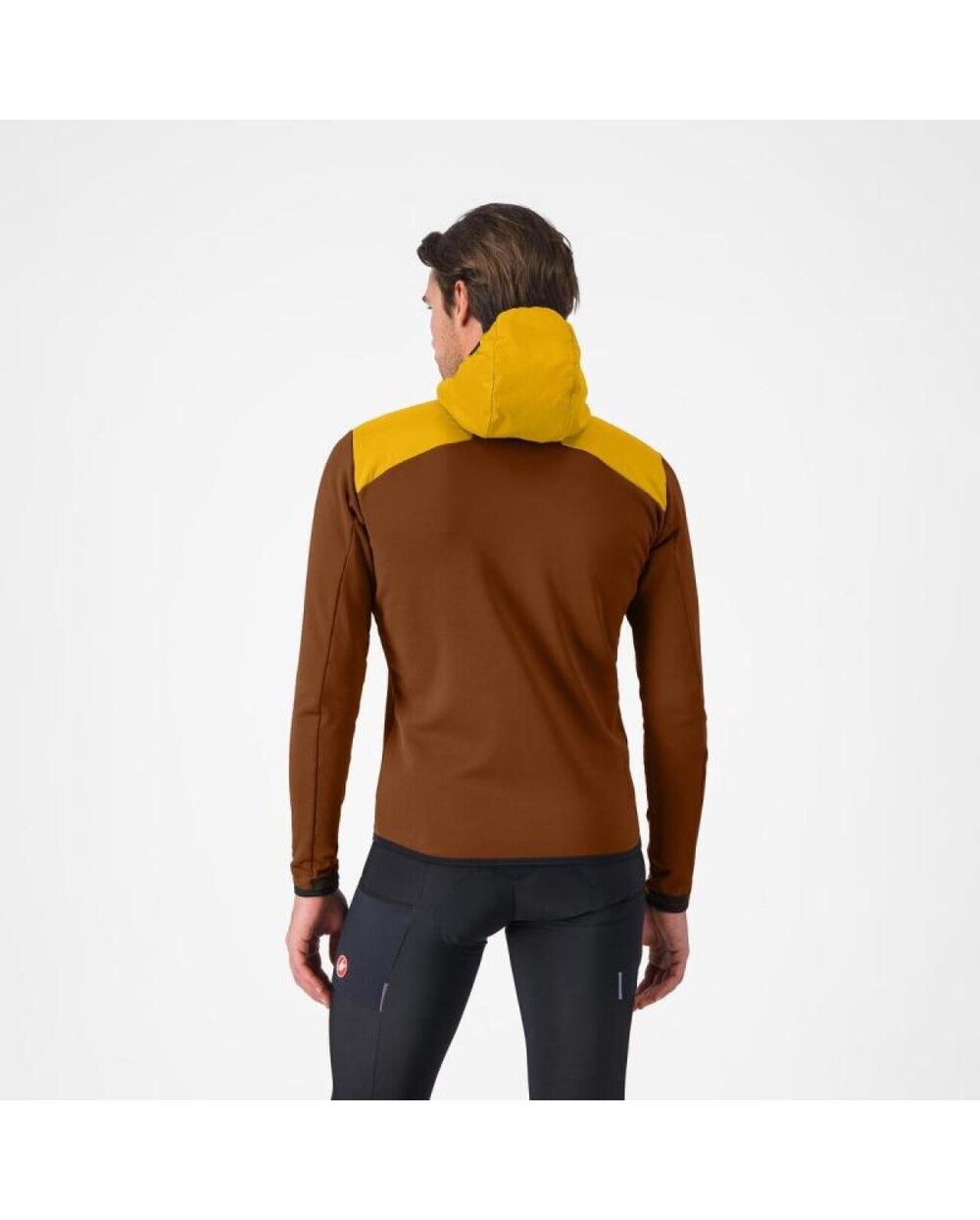 Designed for cycling and off cycling, a warm fleece jacket with a nylon overlay on the chest and hood. Fleece sweatshirt with wind-resistant nylon panels Warmer main material CASTELLI Warmer made of multi-layer 100% polyester fleece with a weight of 195 g Hood, upper chest and shoulder overlays made of wind-resistant Japanese ripstop woven nylon material with DWR treatment Half YKK® zip Zip chest pocket Sizes: XS-3XL Weight: 139 g Temperature range: 10-16 °C Colors: 421 burgundy, 414 dark blue, 245 mocha, 353 olive green Cut: trail Waterproof: none Wind resistance: front Material composition: Main material 100% polyester Hood, front top part, arms 100% polyamide