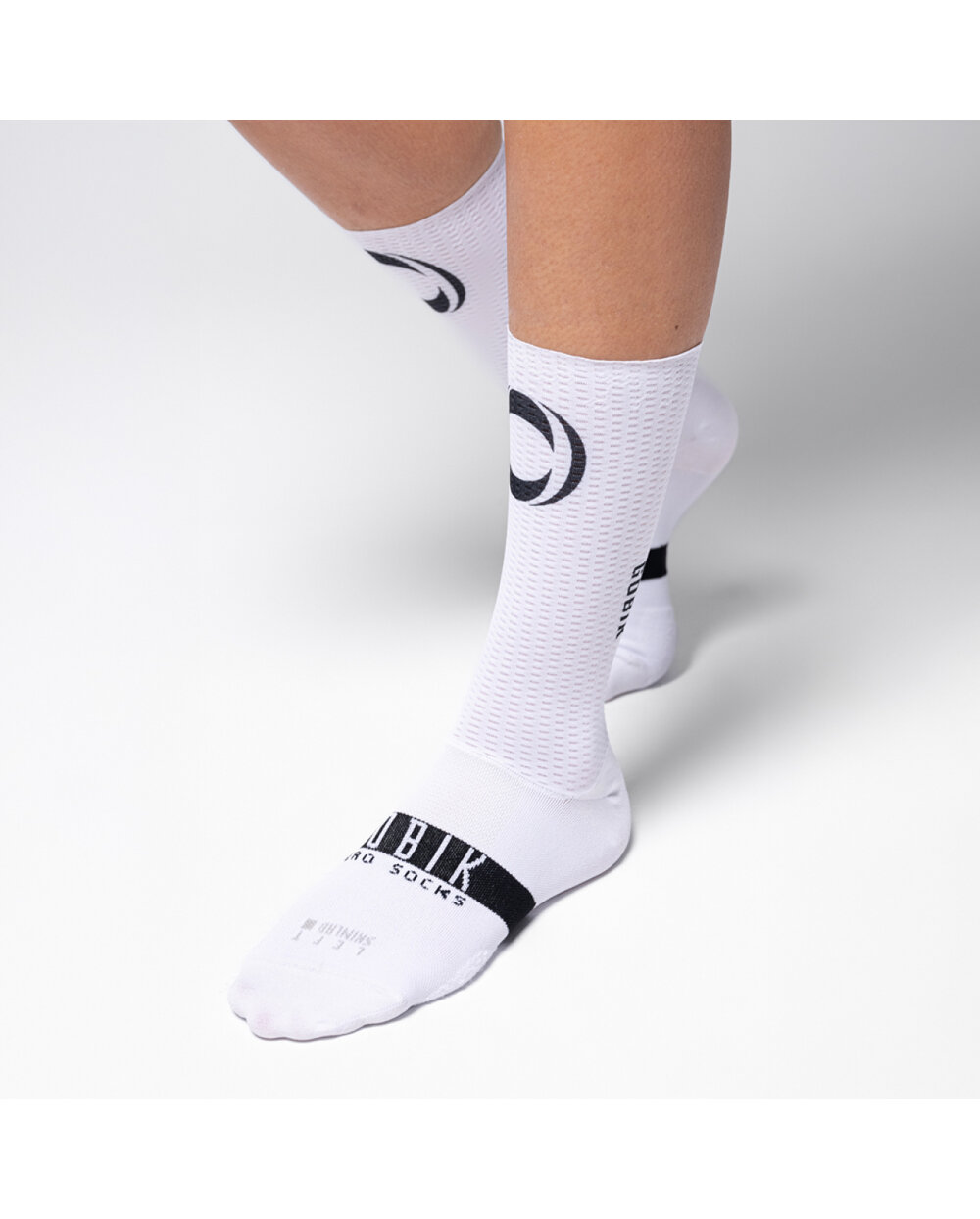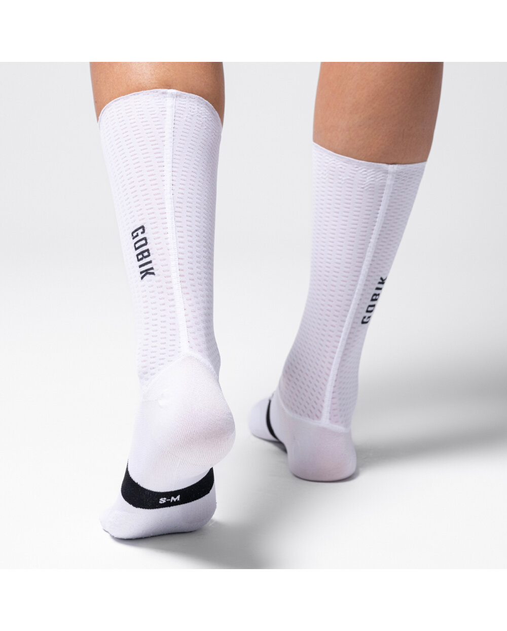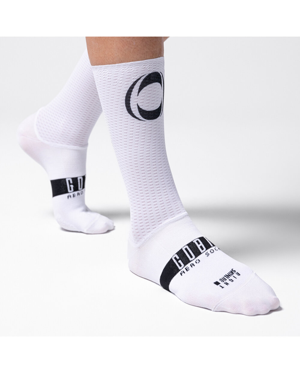 Aerodynamic socks designed for competition and intense training in extreme heat conditions, where every detail counts. With a technical structure tested in wind tunnels by WorldTour teams, they combine a perforated upper body that optimizes ventilation with an extended height of 22 cm in accordance with UCI standards.