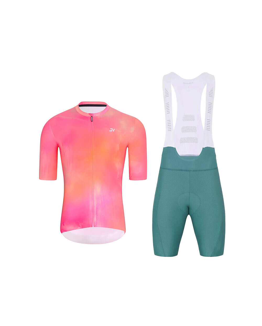 The stylish and functional HOLOKOLO cycling set is the ideal choice for cyclists looking for a combination of striking design, comfort and high performance. The COSMA short-sleeved jersey in orange and pink catches the eye with its vibrant colours and lightweight, high-quality fabric, which is exceptionally comfortable against the skin, breathable and, thanks to its elasticity, adapts perfectly to the body. Practical details, such as a full-length front zip with a protective neck flap, a triple rear pocket, a secure zipped pocket and a seamless hem with anti-slip print, ensure comfort on every ride.