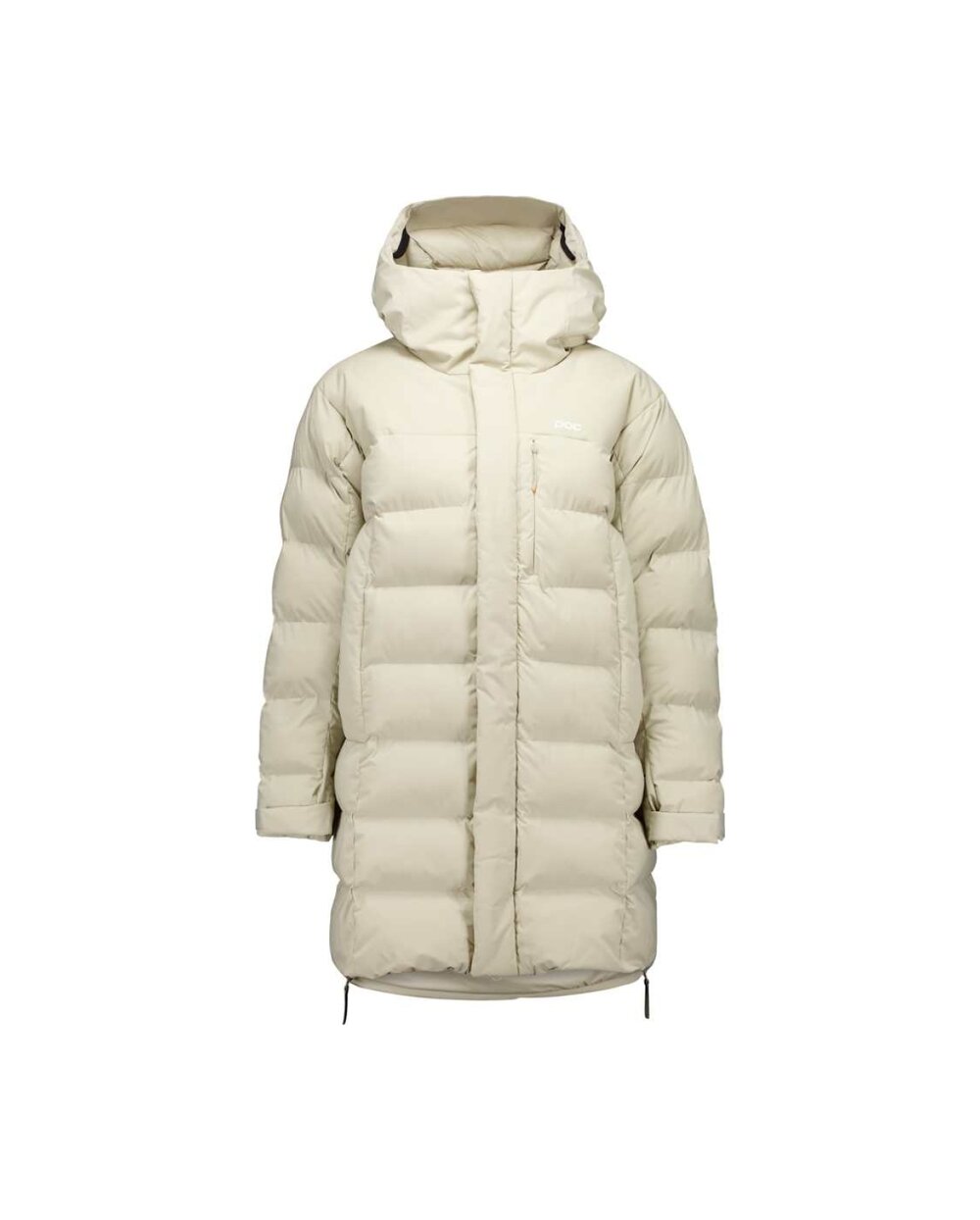 The Poc Race Loft Parka is a long winter jacket designed for ski coaches and athletes who need reliable protection against bad weather during long days on the slopes. It is made of multi-layer nylon with a water-repellent DWR treatment and a water column of 10,000 mm, which ensures resistance against rain and snow. Thermore® Ecodown Fibers Genius insulation, made from recycled PET, provides excellent warmth even when wet. The hood is helmet compatible and easy to adjust with one hand. Side zippers allow for a better range of motion, which increases wearing comfort. The jacket is equipped with practical Pockets, including a ski pass Pocket, and reinforced areas on the shoulders for greater resistance when carrying skis.
