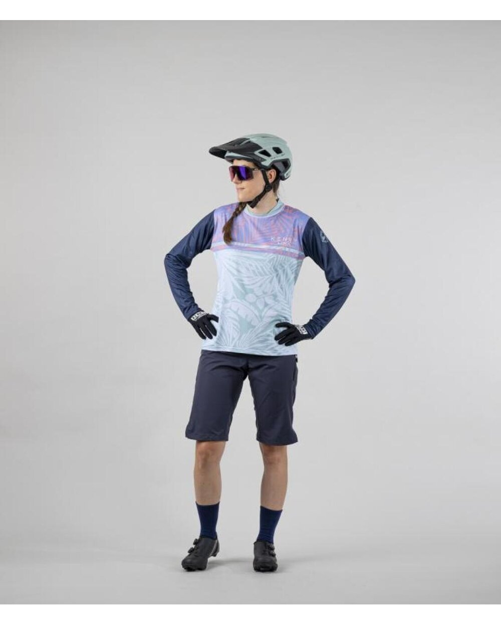 Women's specific form-fitting cut with long elastic sleeves. Breathable fabric in back and under arms for better ventilation. 100% polyester. Incomparable sublimation printing. Edge finishing. Comfortable Lycra collar. XS/34, S/36, M/38, L/40, 42/XL Colors: black/pink/white, black/sky, khaki/navy blue, navy blue/floral - ideal in combination with CHARGER shorts 2504040