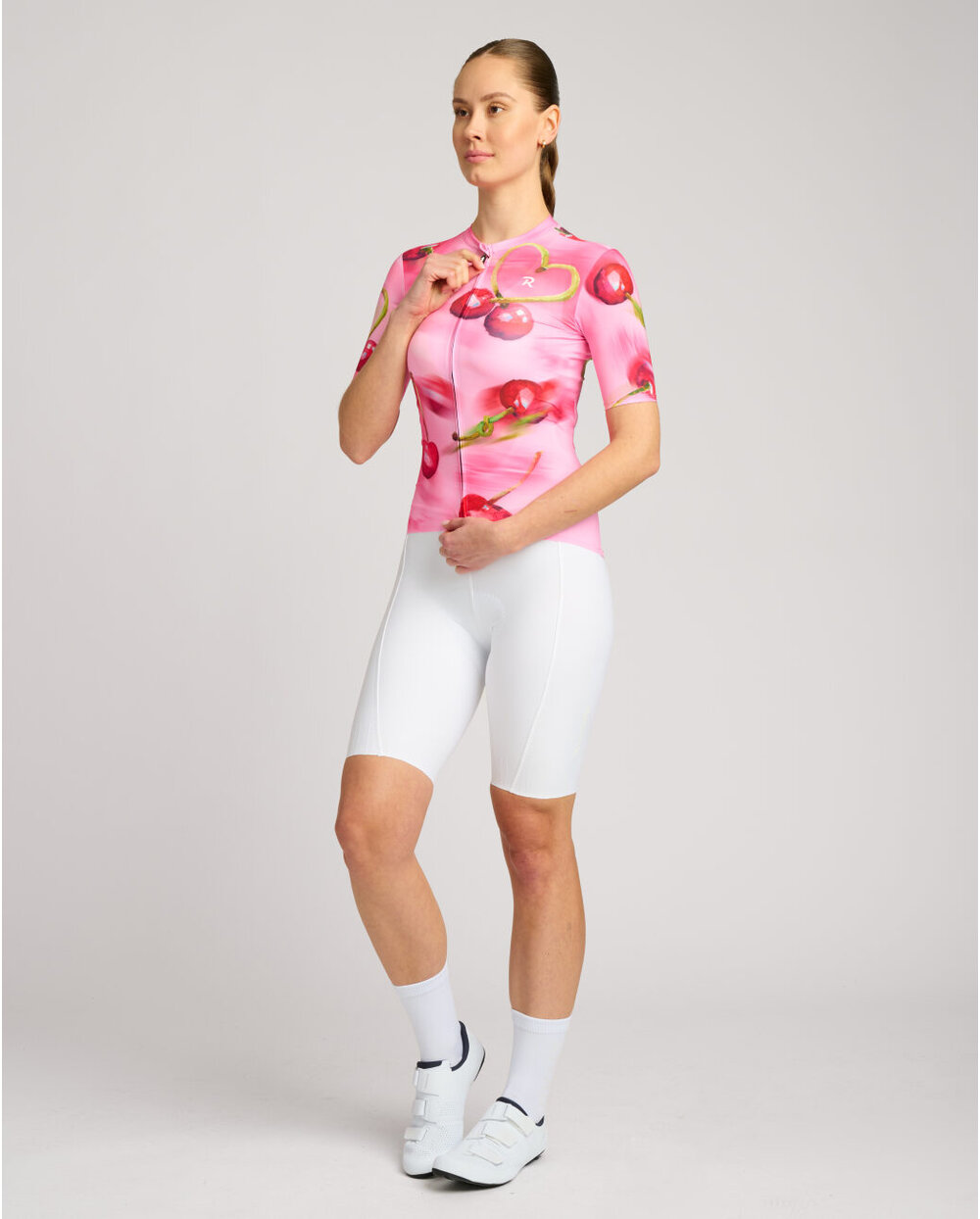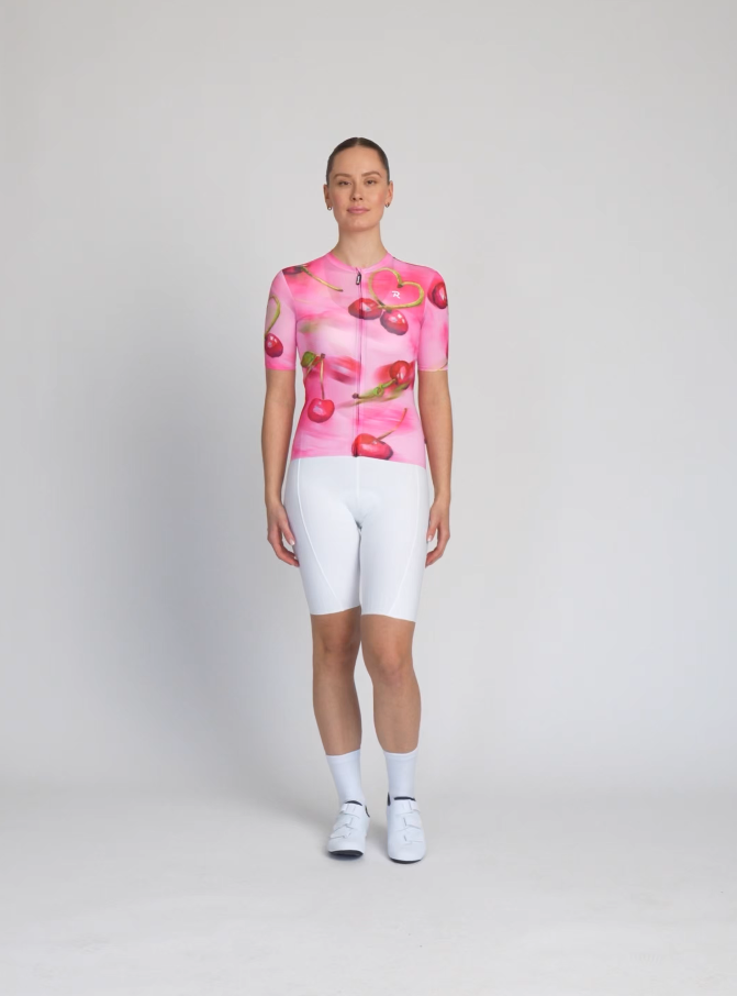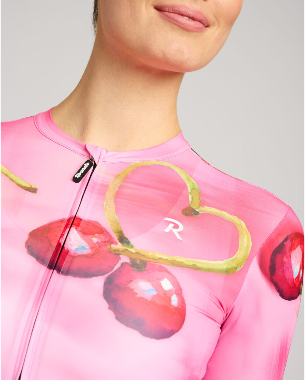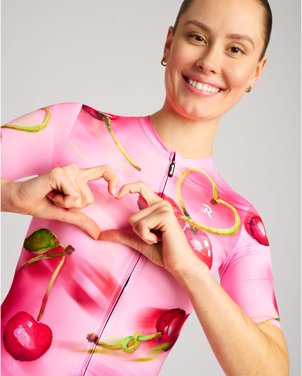 Cherie is not just a swimsuit - it's a vibe - the softness of summer and femininity. Hand-illustrated cherries that shimmer in motion on the fabric, just like you on the road. The heart-shaped detail in the shape of a cherry tree stem is a subtle but playful signature of the love of cycling.