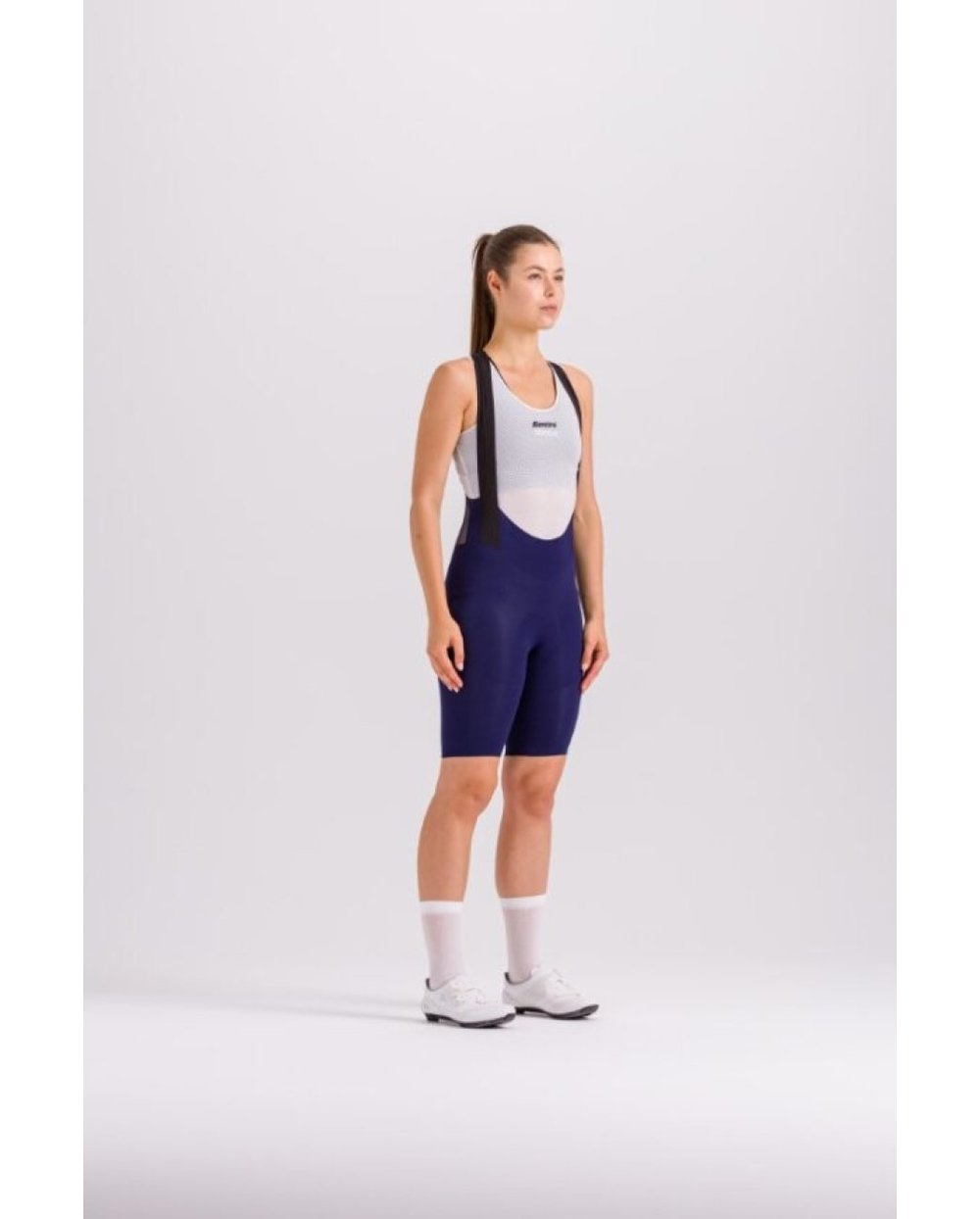 The Santini Plush women's cycling shorts with suspenders are ideal for comfortable, efficient rides on medium to long distances. Thanks to the Italian Premium Fit fabric, which is incredibly stretchy, highly compressive and soft to the touch, the model will provide you with maximum comfort. Made from recycled polyamide with a matt finish, the shorts have a clean, elegant look. Seamless elastic straps at the front follow the shape of the body, while the extremely light, stretchy mesh at the back ensures perfect ventilation. The shorts also feature internal anti-slip grips on the legs to hold them firmly in place when pedaling. A GILevo lining is sewn into the shorts with a gel core that absorbs shocks evenly and progressively. For enhanced visibility, the shorts feature reflective details on the back of the thighs.