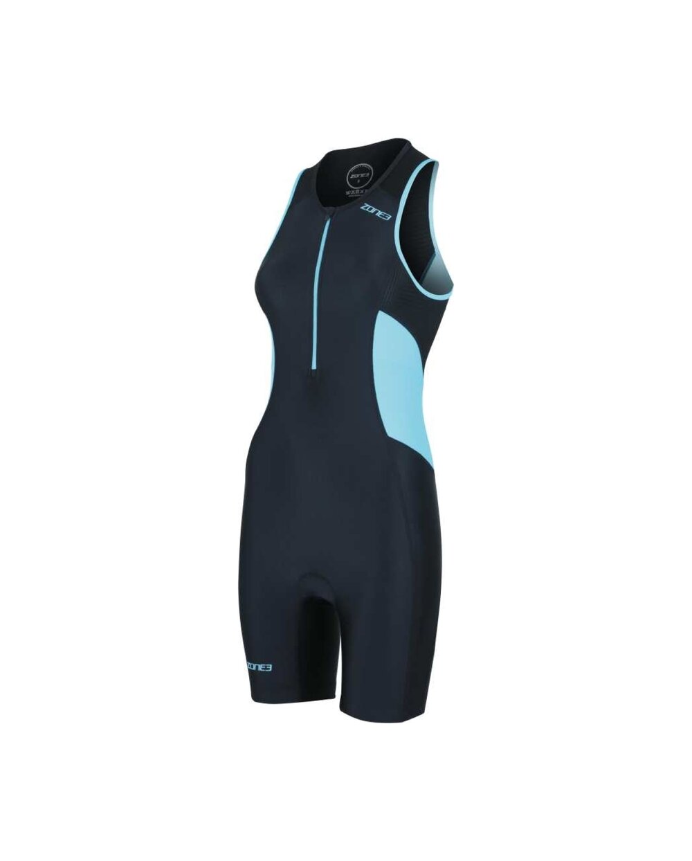 The women's Zone3 Activate Trisuit in an elegant black-turquoise design is a versatile sports suit designed specifically for the needs of triathletes. The suit combines highly breathable and elastic Lycra Sport materials that ensure excellent temperature management, sweat wicking and comfort throughout performance. The back part with a light "waffle" panel increases breathability and contributes to a comfortable and flexible fit without compromising freedom of movement. Technical details include the Tri-lite performance insole, which has been thoughtfully positioned to reduce irritation and provide comfort during the cycling portion without restriction during running or swimming. The elastic technology used in the shoulder and neck area allows the skirt to fit tightly but comfortably without pressure. The suit is also equipped with a front zipper, which simplifies dressing and at the same time offers the possibility to regulate ventilation during more intense loads. The back pockets provide practical storage for food or small personal items. The design is complemented by silicone UFO grips that keep the pants firmly in place without unwanted movements, and flat seams that reduce friction and increase resistance to skin irritation. This trisuit is ideal for triathletes who are looking for reliable performance and comfort during training and races in the warmer months of the year.