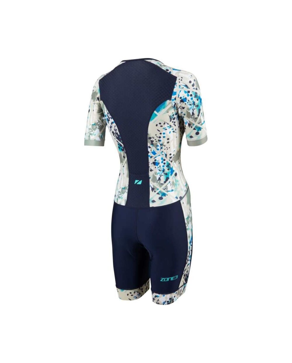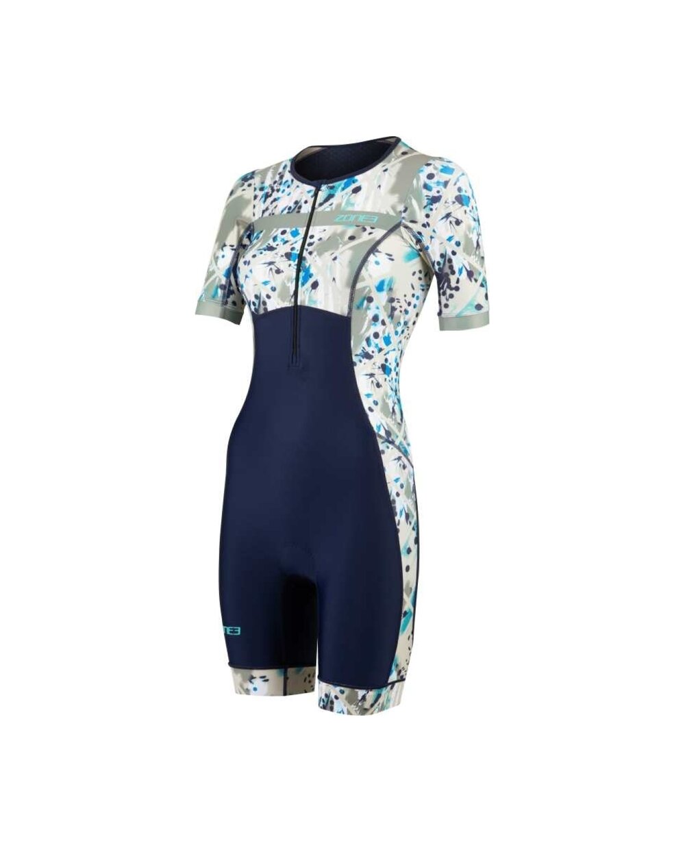 The Women's Zone3 Activate+ Short Sleeve Trisuit is a technical triathlon suit designed for female athletes who value a combination of performance, comfort and sustainability. This model is based on the popular Activate+ line, which offers quality materials, functional details and a modern design suitable for training and race days. The trisuit is made of 100% recycled performance fabrics that ensure high elasticity, good moisture removal and quick drying from the first moment of performance. The back contains a recycled mesh panel that improves breathability and keeps the body cool even during heavy loads. The ergonomically positioned Tri-Lite insole provides comfort during the cycling portion of the race without restricting running or swimming, and the recycled silicone UFO grips keep the pants securely in place without unwanted movement. The suit is equipped with a front zipper for easy dressing and more efficient ventilation and a rear elastic pocket for energy gels or small personal items. The stylish contrasting color Sand Storm/Navy-Sand gives the combination a modern sporty look and is ideal for triathletes looking for reliable performance and comfort in every discipline.