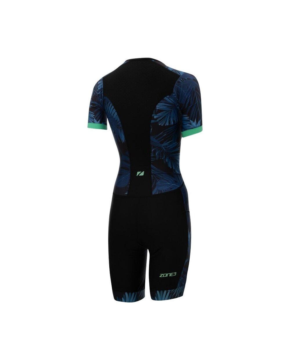 The Women's Zone3 Activate+ Tropical Palm Short Sleeve Trisuit is designed to provide high breathability, comfort and an aerodynamic profile during training and race days. The Activate+ series builds on the success of the original series and brings improved technical materials and a modern printed look that will give you confidence at the start and during the race. The suit is constructed from highly elastic and breathable fabrics — the front panels of high-performance Lycra Sport fabric ensure optimal fit and coverage, while the back with an ultra-light "waffle" panel promotes maximum ventilation and comfort throughout performance. Short sleeves offer better coverage and aerodynamic benefits without restricting movement. The triathlon suit has an ergonomically placed Tri‑Lite insert, which increases comfort during the cycling part without restrictions during running or swimming. The front zip allows for easy dressing and effective regulation of ventilation as needed, while the rear elastic pocket offers practical space for energy gels or small personal items. Silicone UFO grips keep the pants firmly in place without unwanted movements, and flat seams minimize friction for increased comfort throughout the race.