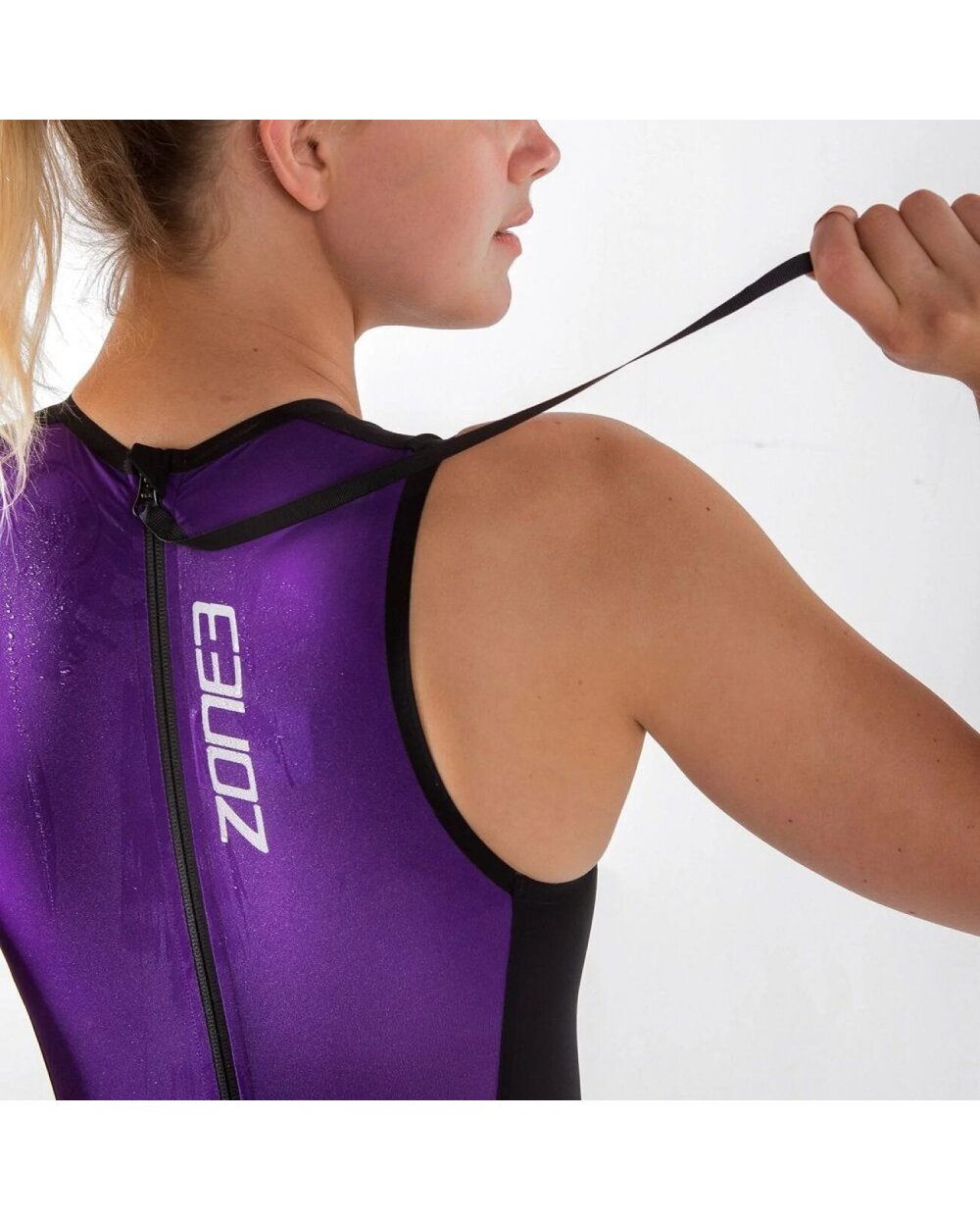 The Zone3 Streamline Sleeveless Swimskin is a women's sleeveless swimskin designed for triathletes and swimmers who want to improve their hydrodynamics and speed when swimming without a wetsuit. It is a lightweight and compressive swim skin that is worn over race kit or leotards and helps reduce water resistance, promoting more efficient and faster swimming. The suit is made of lightweight Italian fabric with high compression and contains hydrophobic (water-repellent) layers that minimize water absorption and maintain shape during performance. The seams are fully welded and the material is covered with a nano-surface treatment, thanks to which the wearing comfort is high and the water resistance is low. A back zipper makes it easy to get on and off, while a brighter back panel improves visibility in the water.