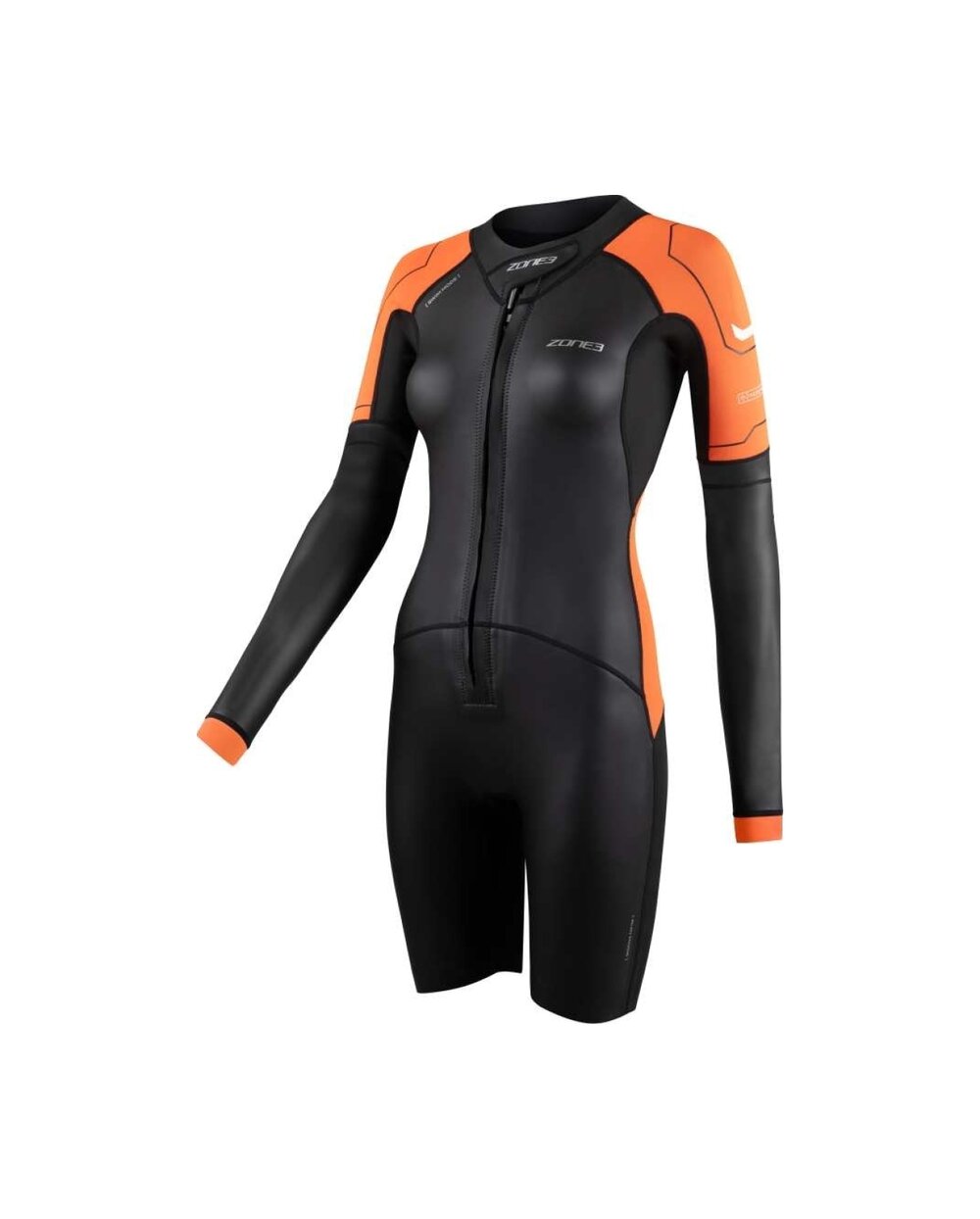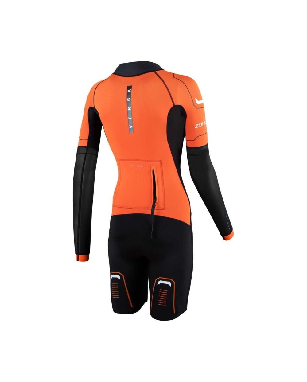 Zone3 Women's Versa Swimrun is a versatile women's wetsuit designed specifically for the swimrun discipline, where swimming and running alternate smoothly. The suit offers an ideal balance between flexibility, thermal comfort and durability, making it suitable for both beginners and advanced athletes. The combination of Yulex® natural rubber and Speedflo neoprene ensures good flexibility, a more ecological approach to production, and at the same time reduced water resistance for more efficient swimming. The front zipper allows for quick dressing and easy temperature regulation during running or transitions, which is key in swimrun. The shorter cut of the sleeves together with the possibility of supplementing them with removable panels makes it possible to adapt the suit to the current conditions. A practical element is the integrated pockets, which provide enough space to store energy gels or small mandatory equipment. Bold orange details increase visibility in open water and contribute to safety.