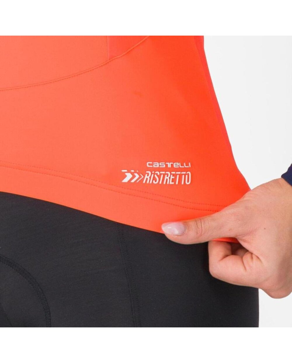 This vest is made for when you need to be warm throughout the ride. It is our warmest vest, but thanks to its exceptional breathability it covers a wide temperature range. The technology of the CASTELLI Ristretto material makes it so versatile. The material is designed with breathability, so it is windproof, but lets in very little air, which wicks away more sweat and keeps you dry. The front is made from a medium-weight version of the Ristretto material, while the back is made from an elastic fabric for even more breathability. You will stay dry, which means you can keep warm even with a thinner vest. You can adjust the ventilation with the YKK® Vislon® double zipper. Three spacious back pockets can hold your gear. The collar is high enough so you can leave the neckerchief at home.