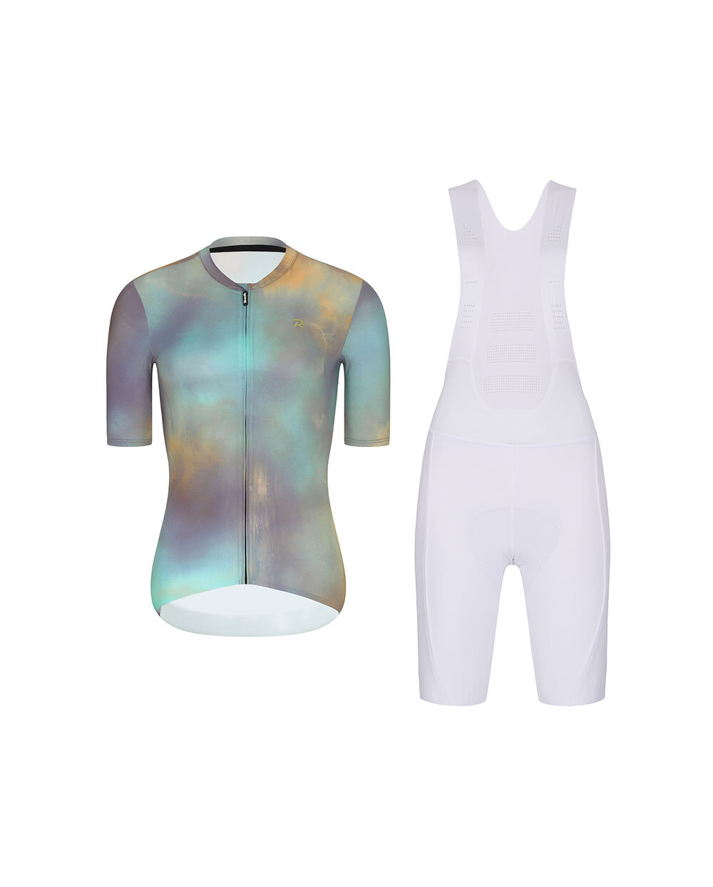 The Rivanelle COSMA & NOVEL PRO women’s cycling kit is the ideal choice for female cyclists looking for a combination of striking style, comfort and performance on every ride. This coordinated set combines the elegant COSMA jersey in a purple and gold colourway with the premium NOVEL PRO white bib shorts, creating a modern and functional outfit for both training sessions and long rides.