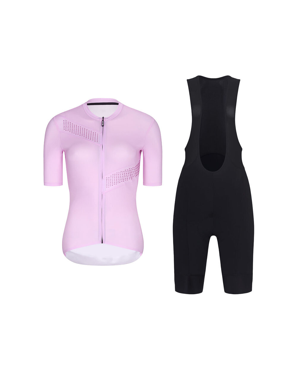 The Rivanelle women’s cycling set is the ideal choice for female cyclists who want to combine style, functionality and comfort in one perfectly coordinated outfit. The combination of the pink CRYSTELLE short-sleeved jersey and black ACTIVE ELITE shorts with braces creates an elegant, sporty look that will stand out on every ride. The Rivanelle CRYSTELLE jersey catches the eye at first glance with its minimalist design, which reveals subtle shimmering details in the same shade as the jersey when in motion. The lightweight, high-quality fabric is very comfortable against the skin, highly breathable and, thanks to its elasticity, fits the body beautifully. Practical features include a full-length front zip with neck protection, a triple rear pocket complete with a zipped security pocket, and a seamless hem with an anti-slip print that helps keep the jersey in place whilst riding. The Rivanelle ACTIVE ELITE cycling shorts with bib straps are designed for maximum comfort during summer rides. The lightweight, stretchy and quick-drying fabric ensures comfort even during prolonged wear, whilst the comfortable foam pad effectively wicks away sweat and helps reduce friction. The tapered fit adapts well to the body and, together with the bib straps, contributes to stability and comfort whilst cycling. This cycling set is a great choice for all female cyclists looking for a harmonious blend of feminine design, practical details and reliable comfort with every kilometre.