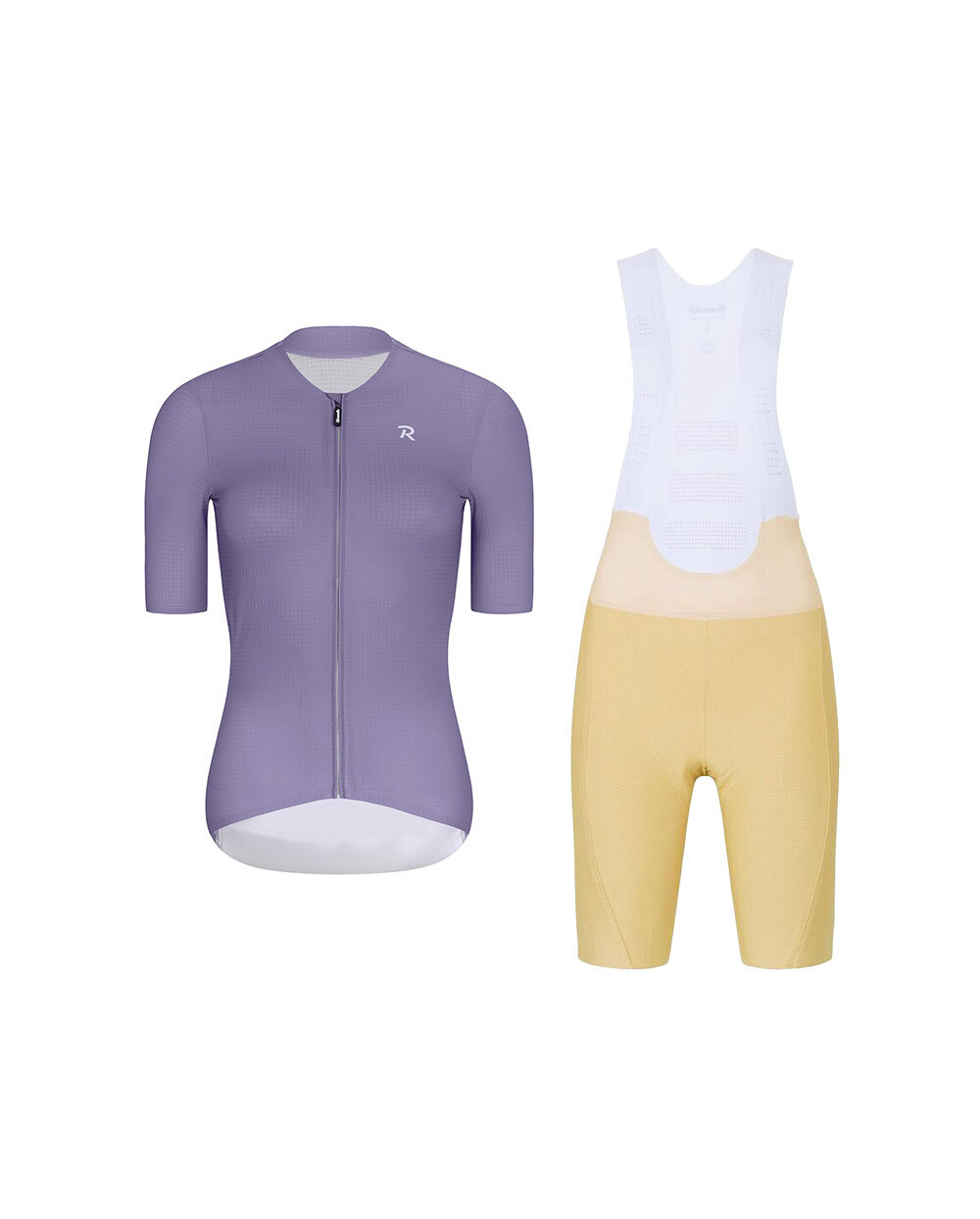 The Rivanelle women’s cycling set is the ideal choice for cyclists looking for a combination of performance, comfort and modern style. The combination of the ELEVATE short-sleeved jersey in purple and the NOVEL PRO bib shorts in beige is designed for intense training sessions and long hours in the saddle.