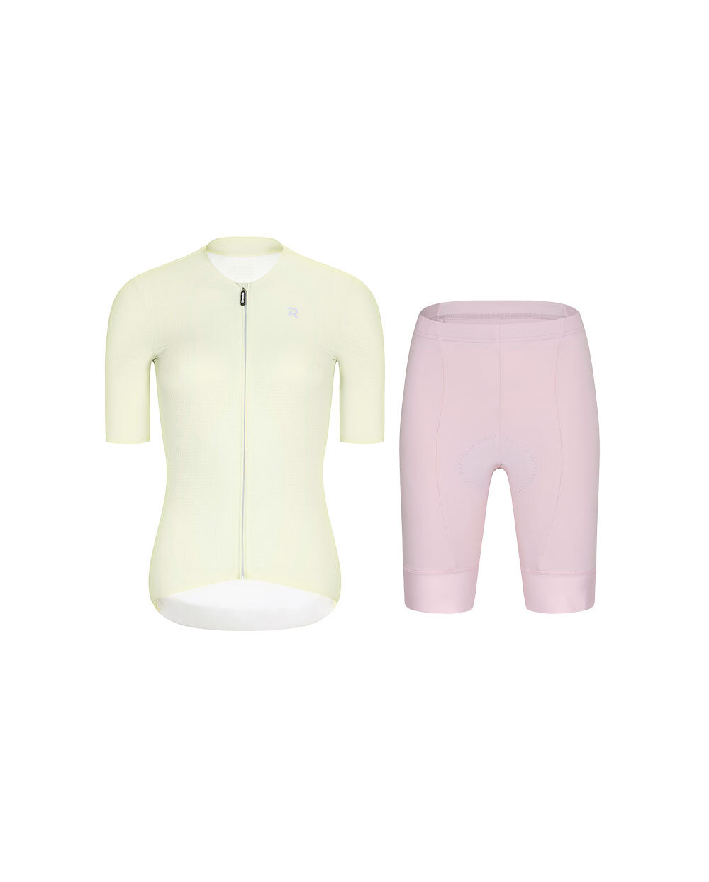 The Rivanelle ELEVATE + DYNAMIC ELITE women’s cycling set is the ideal choice for female cyclists looking for a combination of performance, comfort and elegant, modern style. The combination of an ivory short-sleeved jersey and pink bib-free shorts creates a functional and visually harmonious outfit for training sessions, rides and long summer rides. The ELEVATE jersey is designed for performance cycling and maximum comfort throughout the day in the saddle. Thanks to a new fabric with an airy texture, it effectively wicks away moisture even at higher intensities, adapts to the body and reliably retains its shape. Wearing comfort is enhanced by an improved collar design, a zip with neck protection, three rear pockets including a hidden zipped pocket, and a non-slip hem at the back of the jersey. The minimalist design emphasises its timeless character. The DYNAMIC ELITE bibless shorts complement the set with a high level of comfort and functionality. The lightweight, quick-drying fabric and elasticated cut adapt perfectly to the body and ensure freedom of movement whilst riding. A comfortable foam pad wicks away sweat, helps reduce friction and, thanks to anatomically shaped grooved channels, provides relief from saddle pressure. The hem of the shorts prevents them from riding up, so you can fully concentrate on your performance and the joy of riding. This set is a great choice for all female cyclists who want to ride longer, more comfortably and look confident with every kilometre.