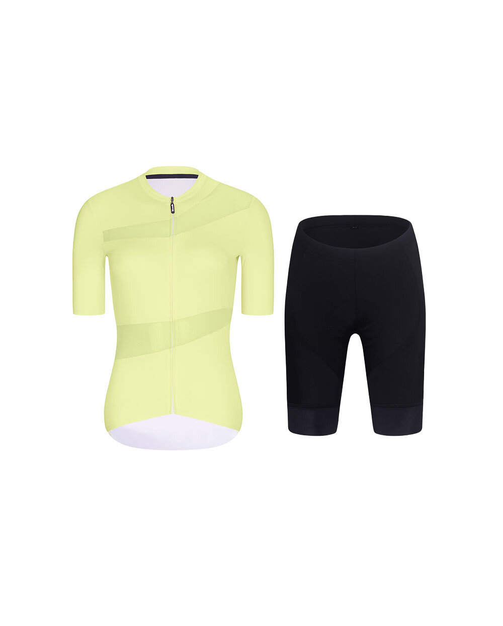 The Rivanelle GLAMOR + DYNAMIC ELITE set is the ideal choice for female cyclists who want to combine style, comfort and functionality in a single coordinated outfit. The yellow GLAMOR short-sleeved cycling jersey stands out with its elegant pastel design, feminine look and comfortable, lightweight fabric, which is exceptionally breathable and fits the body perfectly. Practical details such as a full-length zip with neck protection, a triple rear pocket with a zipped security pocket, and a seamless hem with anti-slip print ensure comfort on every ride. The DYNAMIC ELITE black cycling shorts without braces perfectly complement the jersey, not only in terms of appearance but also in terms of their functional properties. The lightweight, quick-drying fabric, combined with the elasticated cut, provides maximum comfort whilst on the move. The anatomically shaped foam pad with grooved channels helps reduce pressure in the seat area, wicks away sweat and minimises friction, so you can fully enjoy even longer rides. The hem of the shorts is designed to prevent them from riding up whilst cycling. This set is a great solution for summer cycling trips, training sessions and leisure rides. It offers a harmonious blend of sophisticated design and performance, leaving you feeling confident, comfortable and ready to give your all.
