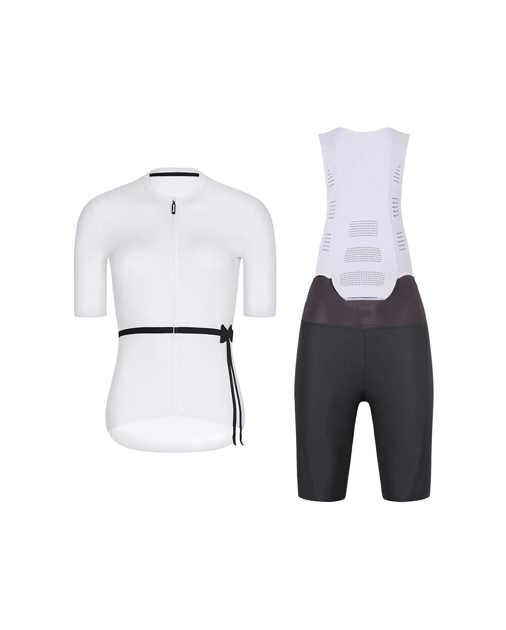 The Rivanelle women’s cycling set combines the stylish LOVELY jersey in white with the high-performance NOVEL PRO bib shorts in anthracite to create a perfectly coordinated outfit for training and long rides. The jersey features an elegant and subtly romantic design with a bow on the side and extended ribbons, whilst the lightweight and breathable fabric feels very comfortable against the skin, fits the figure perfectly and ensures comfort throughout the ride. Practical details such as a full-length zip with neck protection, a triple rear pocket with a zipped security pocket, and a seamless hem with anti-slip print enhance the jersey’s functionality. The NOVEL PRO shorts are designed for maximum comfort even during long hours in the saddle. Premium materials with high elasticity, breathability and moisture-wicking properties help keep the body dry and comfortable even during intense activity. The ergonomic cut with straps, foam cycling pad and gentle compression support the muscles, absorb shocks and contribute to better mobility and reduced fatigue. This set is the ideal choice for female cyclists who want to combine a feminine look, functionality and professional comfort all in one.