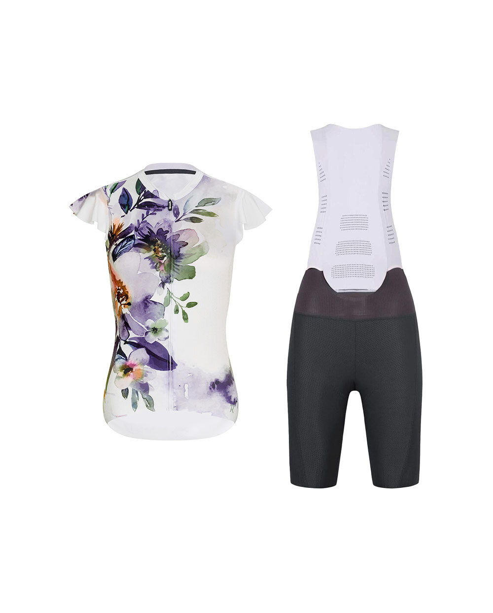 The Rivanelle MISS FLOWERY + NOVEL PRO women’s cycling set is the ideal choice for female cyclists who want to combine feminine style, comfort and high performance on every ride. The combination of an elegant short-sleeved jersey and premium bib shorts creates a functional outfit suitable for training, long rides and leisure cycling. The MISS FLOWERY jersey in a white and multicoloured design celebrates femininity and a love of cycling. The lightweight, high-quality and exceptionally breathable fabric feels very comfortable against the skin, fits like a second skin and allows for freedom of movement even on hot summer days. Thanks to its elasticity, it fits the figure beautifully, whilst the short ruffled sleeves give the design a delicate and elegant look. The practical full-length front zip is covered for greater comfort and skin protection. The back features three pockets and one hidden zipped pocket for small items you want to keep close at hand whilst riding. The NOVEL PRO bib shorts in anthracite are designed for maximum comfort even during long hours in the saddle. The ergonomic cut, excellent breathability and moisture-wicking fabric help keep the body dry even during intense activity. The foam cycling pad provides reliable cushioning and support, enhancing comfort on longer rides. Lightweight and durable materials offer excellent elasticity and compression, promoting mobility and helping to reduce muscle fatigue. This set is the perfect choice for women who want to look great on their bike whilst feeling comfortable from the first to the last kilometre.