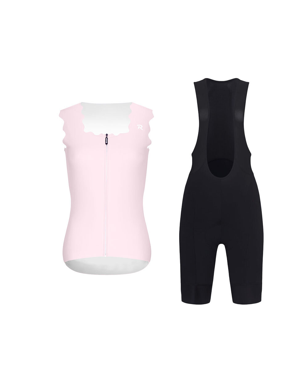The Rivanelle women’s cycling set combines style, comfort and functionality for summer rides and sporty-casual days. The set comprises the SCALLESSA sleeveless jersey in pink and the ACTIVE ELITE black cycling shorts with braces, which together create an elegant yet highly practical cycling outfit. The SCALLESSA jersey catches the eye at first glance with its original scalloped hem, which gives the cycling kit an exceptionally feminine and modern look. The wavy straps and square neckline flatter the figure, whilst the full-front zip with neck protection, triple rear pocket and zipped security pocket ensure practicality on every ride. Comfort is further enhanced by the seamless hem with anti-slip print at the back of the jersey. The ACTIVE ELITE shorts are designed for maximum comfort during summer cycling. The lightweight, stretchy and quick-drying fabric adapts well to the body and supports freedom of movement. Comfort on longer rides is ensured by a comfortable foam pad, which helps wick away sweat and reduce friction. The tapered cut with leg straps keeps the shorts securely in place and contributes to a better feel whilst riding. This set is the ideal choice for female cyclists who want to combine striking design, feminine style and reliable functionality. It’s perfect for training sessions, leisure rides and longer summer routes.