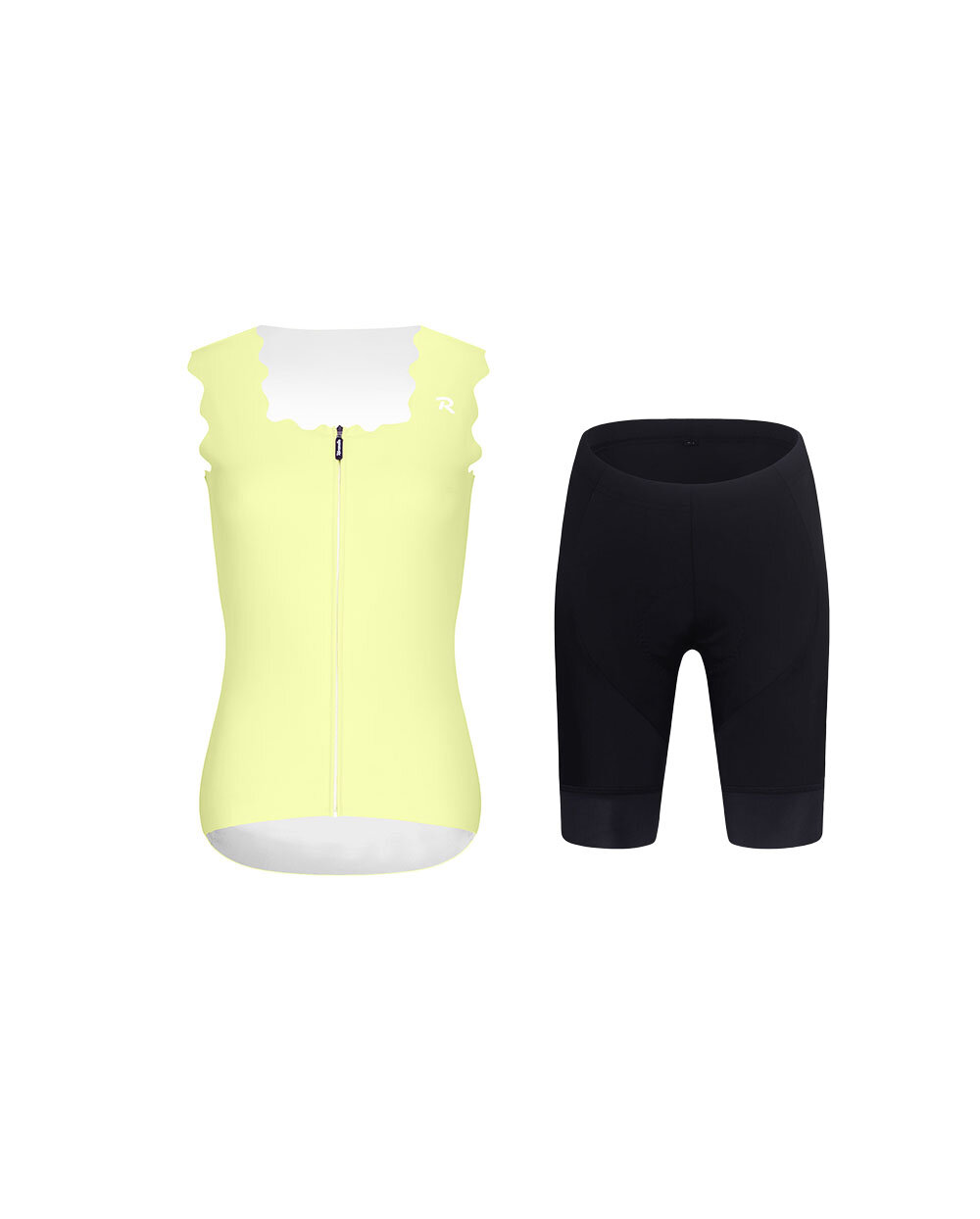 The yellow SCALLESSA sleeveless jersey catches the eye at first glance with its original scalloped hem, which gives the outfit a unique and modern look. The wider, wavy straps and square neckline flatter the figure, whilst the full-length front zip with a protective neck flap offers practicality on every ride. It also features a triple rear pocket with a secure zipped pocket and a seamless hem with anti-slip print at the back.