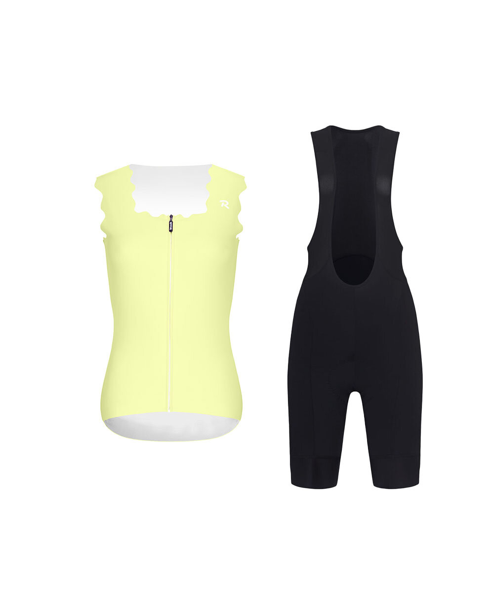 The stylish and functional Rivanelle cycling set combines striking design with comfort that you’ll appreciate on every ride. The yellow SCALLESSA sleeveless jersey features an original scalloped hem, wider shoulder straps and an elegant square neckline, giving it a modern look whilst flattering the figure. Practical features include a full-length front zip with a protective cover, a triple rear pocket with a secure zipped pocket, and a seamless hem with a non-slip print.